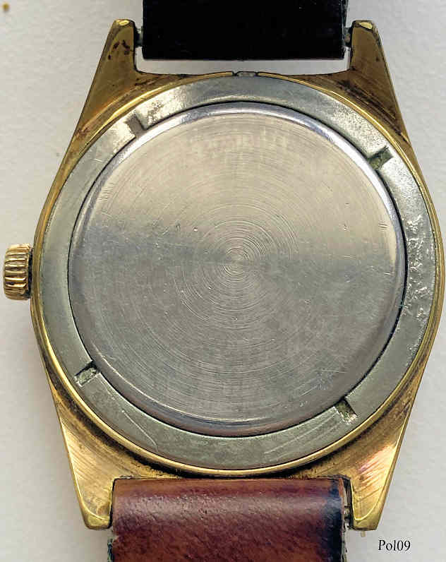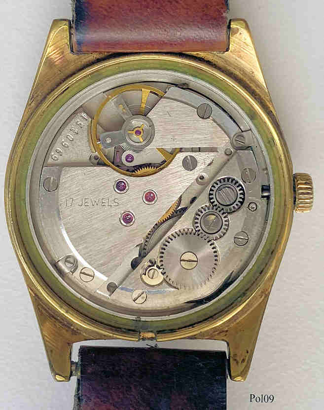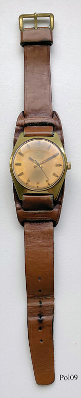 A Poljot handwind watch with red-brown dial. Signed front: ”Poljot, 17 Jewels, Made in USSR” back: ” ”, inside: “17 Jewels, 4510969”, brown leather band with hand protector.