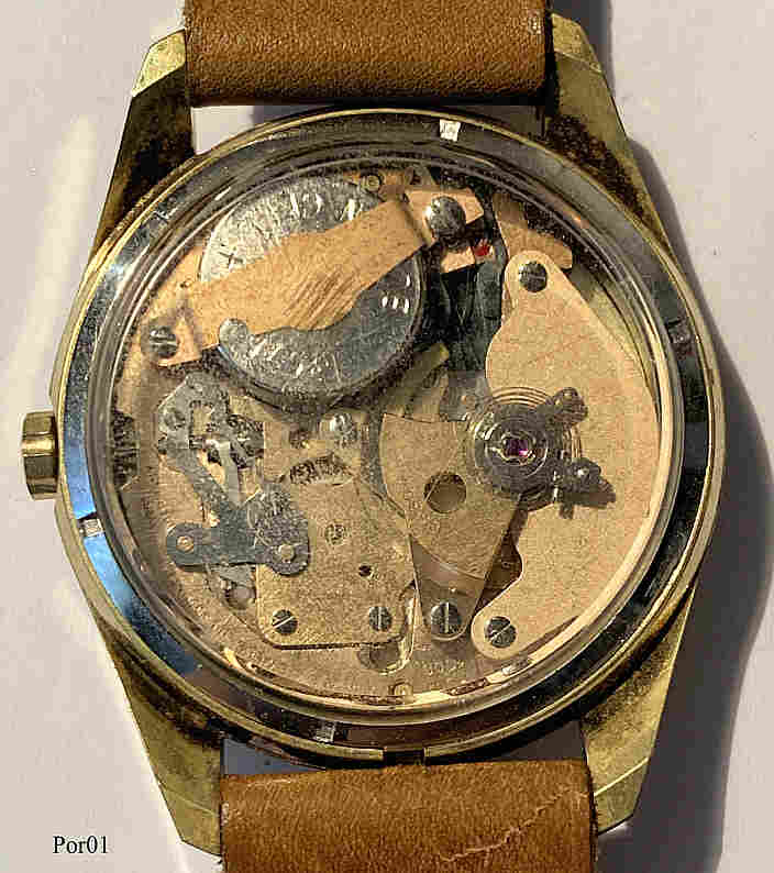 Eine schöne Porta Elechron Uhr mit einem PUW 1000, dem ersten selbst entwickelten elektrischen PUW Werk. Vergoldetes Gehäuse mit genähtem braunem Lederarmband und Glasboden. Beschriftet vorn: ”Porta, Elechron”, innen: ”PUW 1000, 7 seven Jewels, Unadjusted, West Germany”.
