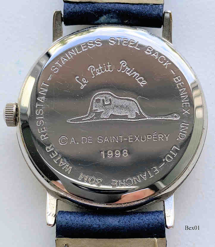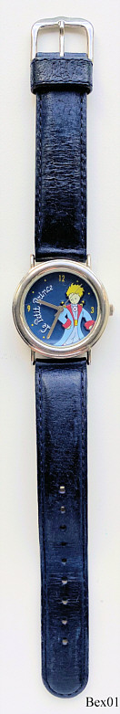 Eine Motivuhr der Firma Bennex. Als Motiv gewählt: Der kleine Prinz von A. de Saint-Exupéry. Beschriftet vorn: “Le Petit Prince”, hinten: ”Water Resistant, Stainless Steel Back, Bennex Ind. Ltd., Etanche, Le Petit Prince, Copyright A. de Saint-Exupéry, 1998”, innen: “TMI, Time Industries Co., No 0 Jewels, Y121E”, Dunkelblaues Lederarmband