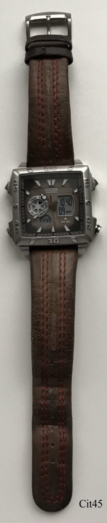 Ein Citizen Eco-Drive Chronograph in ungewohntem quadratischen Gehäuse. Kaliber Citizen U200, mit Analog und Digitalanzeige, Beschriftung vorn: “Citizen, Eco-Drive, WR100“, hinten: “ Citizen Promaster Eco-Drive, Citizen Watch Co.,W.R. 10 Bar, GN-4-S, Japan Movt.,040170, U200-S055008 HST, St.Steel”, innen: “U200, Japan, No Jewels”. Braunes genähtes Lederarmband.
