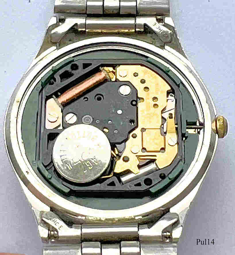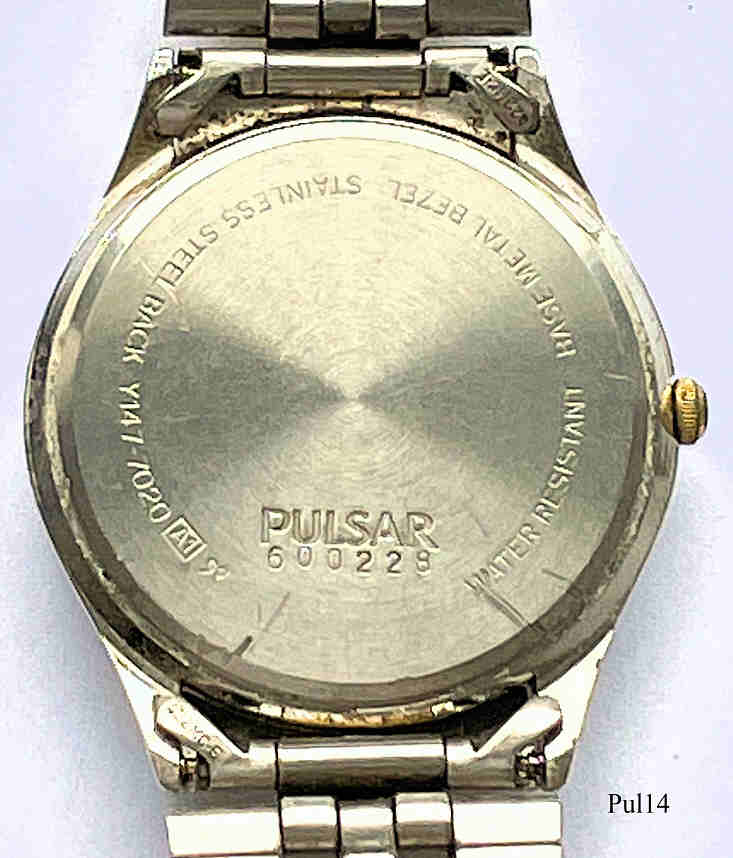 Eine Pulsar Herren Quartzuhr mit schwarzem Zifferblatt und silbernen Balken als Ziffern, Datum bei der 3. Beschriftet vorn: “Pulsar, Quartz”, hinten: ”Pulsar, 600228, Water Resistant, Base Metal Bezel, Stainless Steel Back, Y147-7020 A1”, innen: ”Shiojiri Ltd., 2, Y147A, Japan, No Jewels, Unadjusted”. Kaliber Shiojiri Y147A. Base Metall Gehäuse, Edelstahl Glieder Band mit Goldstreifen..
