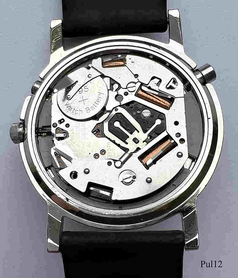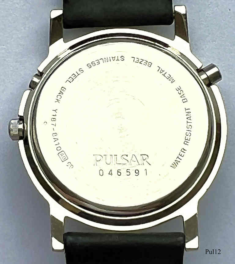 This is a Pulsar Solar Watch with Base Metal Case. The dial is black with a date window. A minute ring is set upon the solar elements.  Signed front:”Pulsar, Solar, Water 100 M Resistant, Japan V122-6A40-SR2 ” back:” Nickel Free, PULSAR,Anti-Mag. 4800 A/m, Water Resistant 10 Bar, Base Metal Bezel, Stainless Steel Back, V122 6A40 A0, 4N0078”