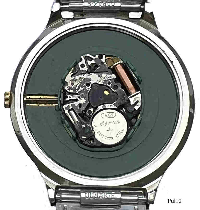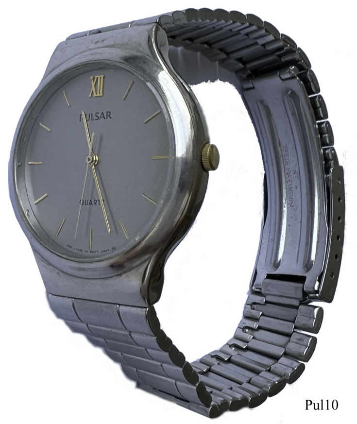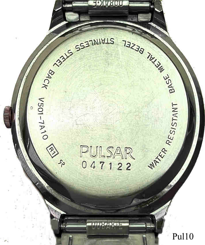 Eine Pulsar Herren Quartzuhr mit grauem Zifferblatt und goldenen Balken als Ziffern. Beschriftet vorn: “Pulsar, Quartz”, hinten: ”PULSAR, 047122, Water Resistant, Base Metal Bezel, Stainless Steel Back, V501-7A10 R1”, innen: ” ”. Kaliber Pulsar V501A. Base Metall Gehäuse.