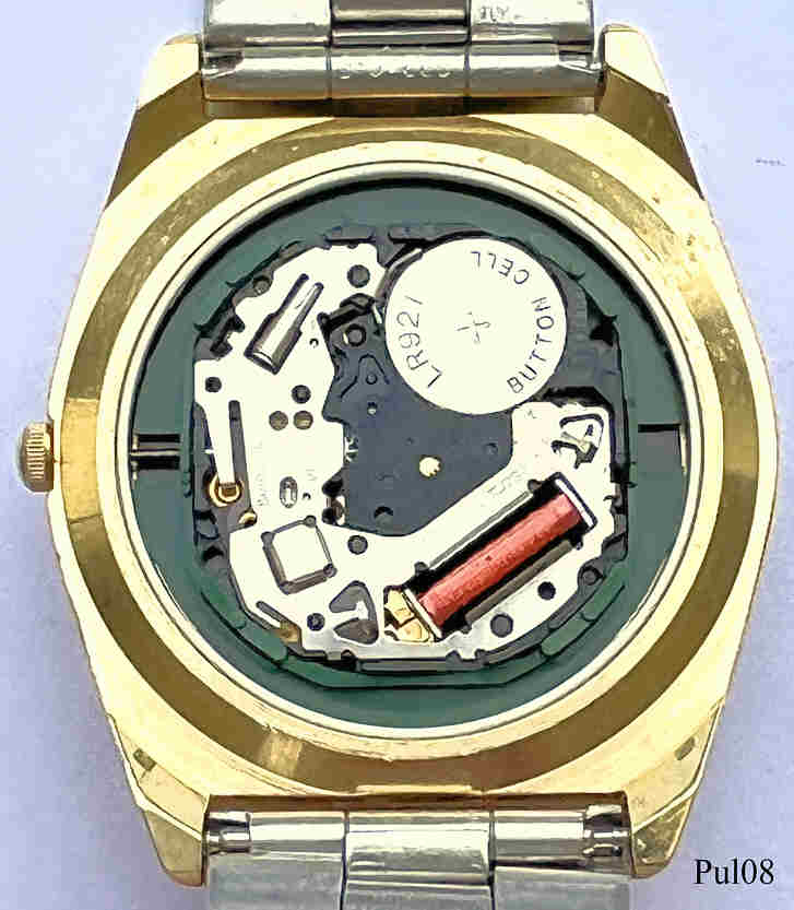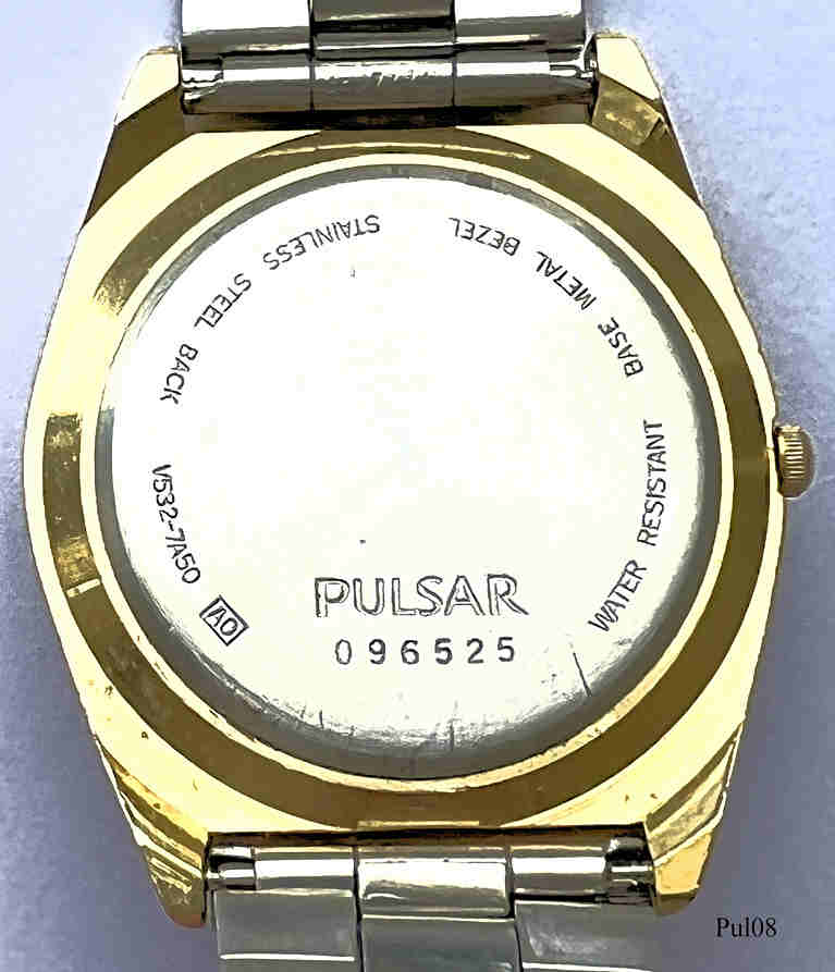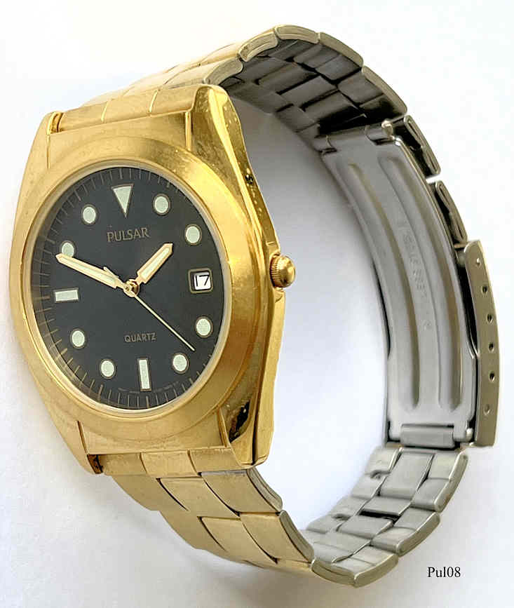 Eine Pulsar Herren Quartzuhr im Taucher Design mit schwarzem Zifferblatt und stark nachlwuchtenden Punkten als Ziffern. Beschriftet vorn: “Pulsar, Quartz”, hinten: ”PULSAR, 096525, Water Resistant, Base Metal Bezel, Stainless Steel Back, V532-7A50 A0”, innen: ”Shiojiri Ltd., 2, V532A, Japan, No Jewels, Unadjusted”. Kaliber Shiojiri V532A. Base Metall Gehäuse vergoldet, Metall Gliederarmband.