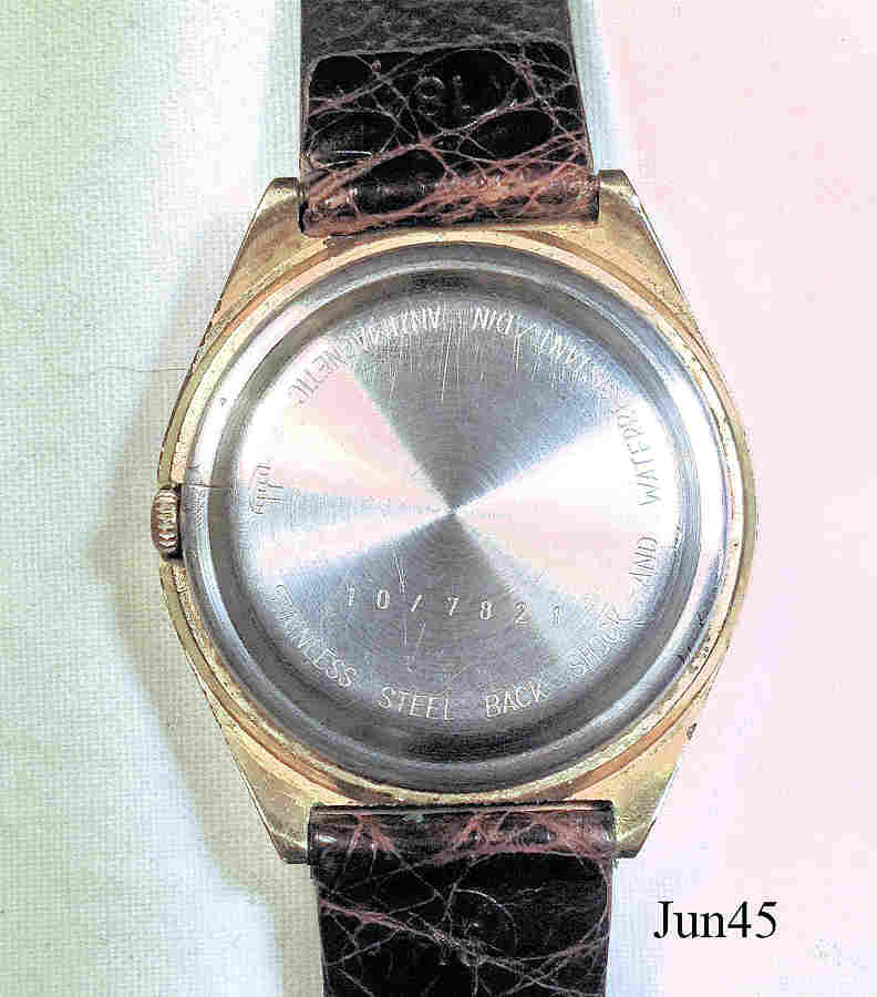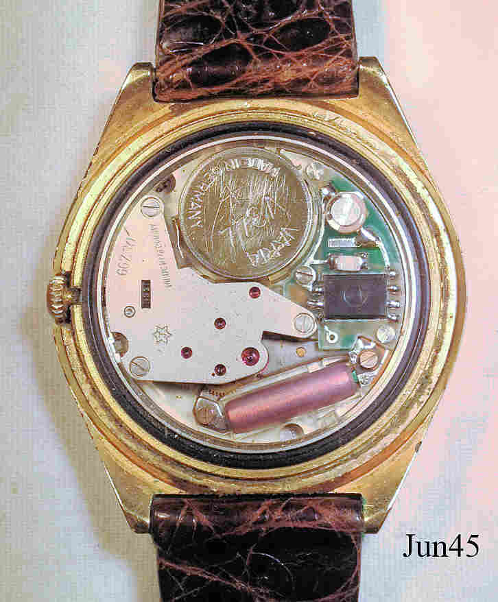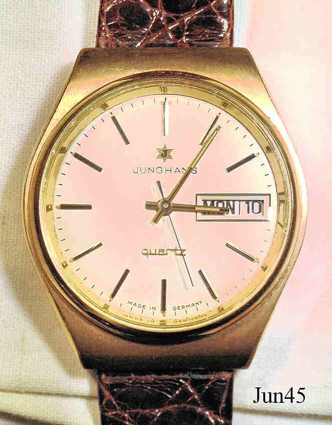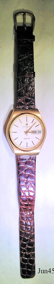 Eine Junghans Quartz Herrenuhr. Hier das weiter entwickelte Kaliber 667.30. Inschrift vorn: ”JUNGHANS, Quartz, Made in Germany”, hinten: ”Antimagnetic, Stainless Steel Back, Shock and Water Resistant / DIN, 10/7821”, innen: ”667.30, Made in Germany”.