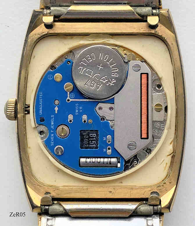 A ZentRaQuartz watch with an ESA quartz movement Caliber 955.411. Gold plated Case with goldtone metal band. Signed front: “ ZentRa, Quartz, ETA Swiss Quartz”, inside: “Unadjusted, seven 7 Jewels, ESA 955.411”, back: “Stainless Steel Back, Swiss Made, 15334, 8.618 100, 54“, Calendar at 6.