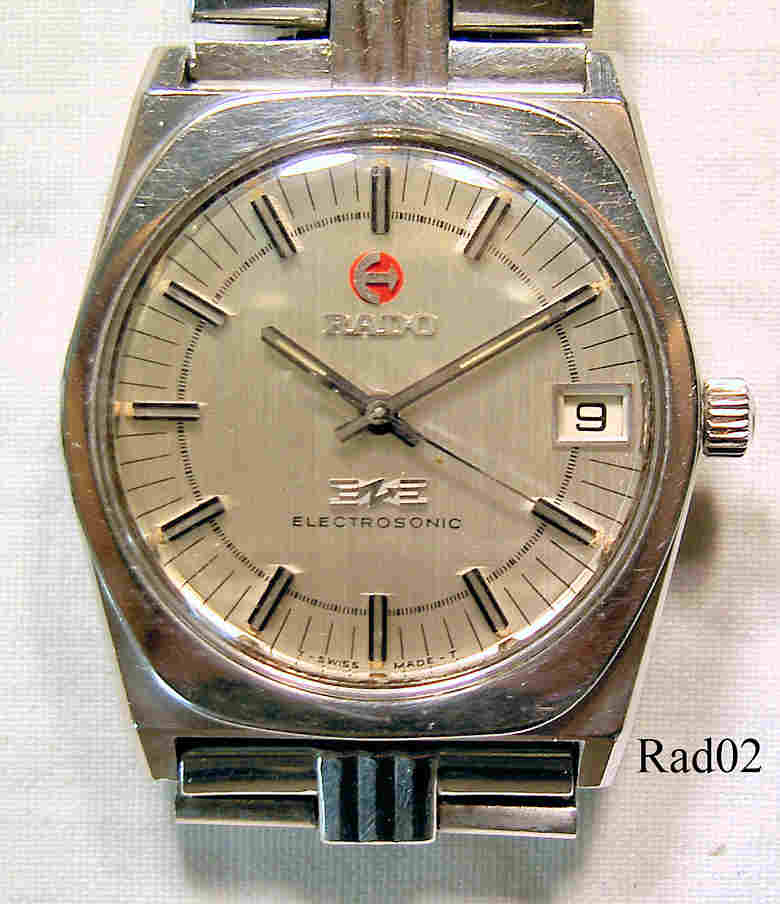 Dies ist eine Rado Electrosonic, ESA 9162, Edelstahl Gehäuse, Edelstahlboden, Kalender bei der 3. Bezeichnung vorn: ”Rado, Electrosonic”, hinten: :”Electrosonic, RADO, Water Sealed”, innen: “RADO, Electro, Sonic, Lic Bulova & Pat. Swiss, 9162, Twelve 12 Jewels”.