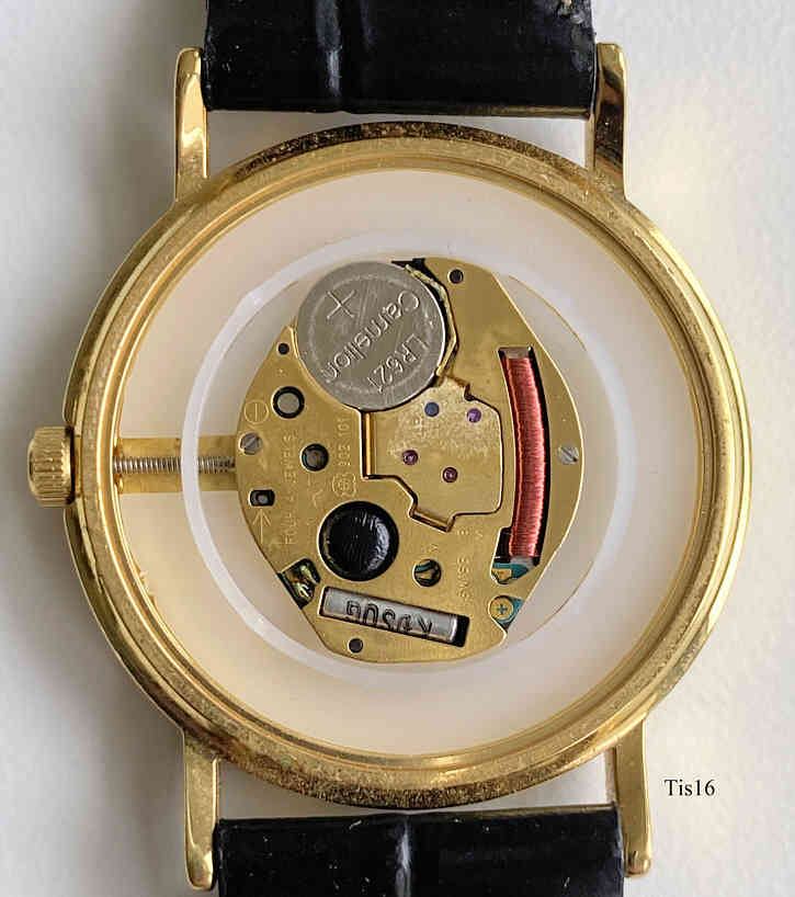 Eine Werbeuhr der Firma Readers Digest, hergestellt von Tissot. Die Uhr trägt auf dem Boden das Readers Digest Logo, den Pegasus. Beschriftet vorn: ”Tissot, 1853, Swiss Made”, hinten: ”Tissot, since 1853, Stainless Steel Back, Waterresistant 30M, Mineral Glass, N°19237, C257K”, innen: ”Four 4 Jewels, ETA 902.101, Swiss V8”, Kaliber ETA 902.101