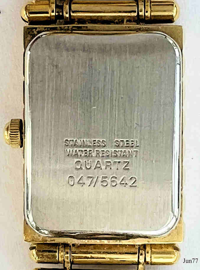 Eine Junghans Damen Schmuckuhr  mit goldfarbenem waagerecht gemustertem Zifferblatt und optisch angepasstem Metall Armband. Vergoldetes Gehäuse und  Stainless Steel Back. Beschriftet vorn: ”€¯Junghans, Quartz”€¯, hinten:  ”Stainless Steel, Water Resistant, Quartz, 047/5642”, innen: ”€¯PUW 510,  Germany, Unadjusted, Four 4 Jewels”€¯, Kaliber PUW 510.