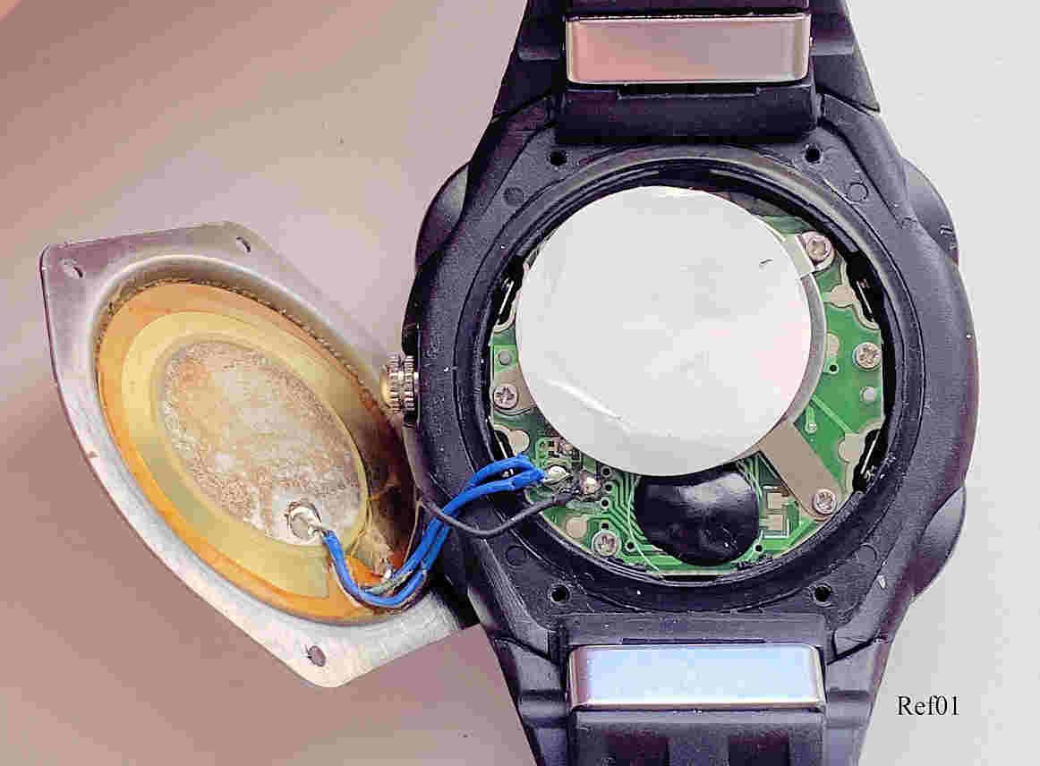 A talking watch from China with analog and digital display. Bezeichnet vorn: “QUARTZ, Water resistant, TalkingWatch”, hinten: “Talk 203, 46535”. Pressing the right button at “1”, the watch tells the time in englisch. .