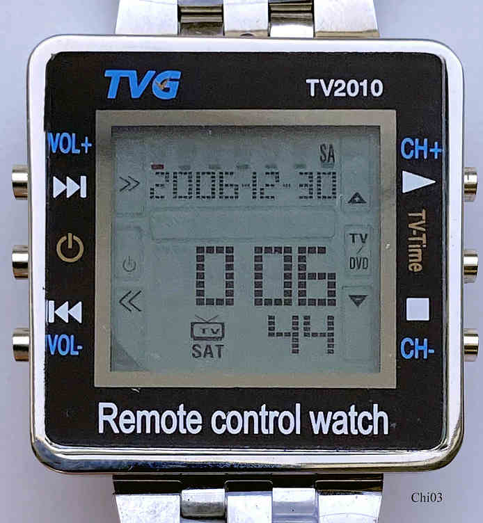 ine moderne LCD Digitaluhr mit eingebauter Fernbedienung für Fernseher und DVD Player. Oberhalb der ”TVG”€ ist seitlich eine Infrarot LED eingebaut, die das Signal übermittelt. Die Uhr stammt aus Hong Kong, interessant auch die Ähnlichkeit des Firmenlogos mit TAG Heuer, sicher kein Zufall. Edelstahl Gehäuse mit Edelstahl Armband.