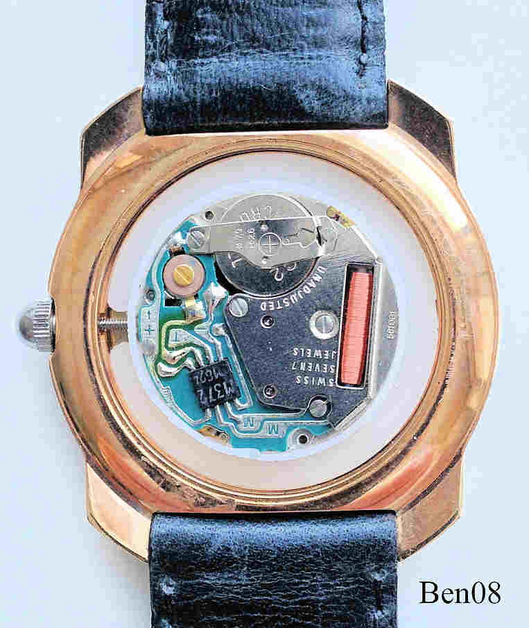 Eine Benetton by Bulova mit extra Sekunde bei der 6, Beschriftet vorn: ”United Colors of Benetton, by Bulova”, hinten: ”United Colors of Benetton, by Bulova, Mod. Dep.,Stainless Steel Back, Water Resistant, Base Metal Bezel.”, innen: “Swiss, Seven 7 Jewels, Unadjusted, 581.001”. Dunkel Grünes Lederarmband mit Benetton Schließe.