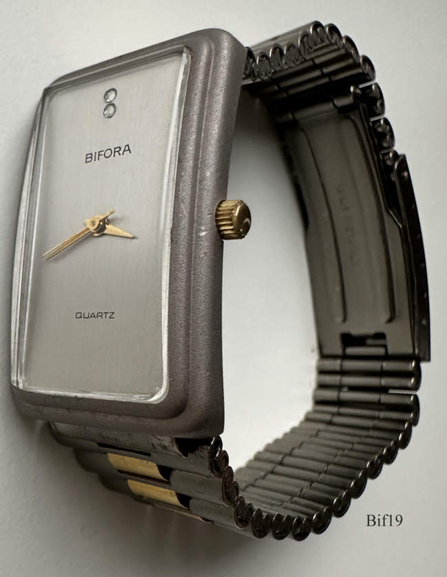 This is a Bifora ladies quartz watch, using a PUW 500 movement and relates to the India manufacturing. Gun metal case, white dial, two points at twelve with central seconds hand. Signed front: ” BIFORA, Quartz”, back: ” ”, inside: “Unadjusted, PUW 500, five (5) Jewels”. Integrated titanium / gold metal band.