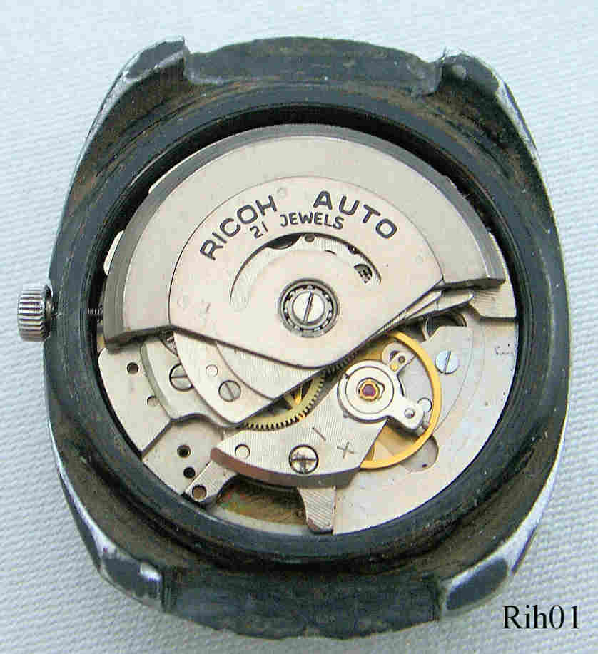 Dies ist eine Automatic Uhr mit Day Date bei der 3 von Ricoh. Der Tag wird als Wort und als Zahl ausgegeben. Beschriftung vorn: ”Ricoh, 21 Jewels, Automatic”, hinten: ”Ricoh, Antimagnetic, All Stainless Steel, Water Resistant, Shockproof, Japan, MT61AS0729AC” auf dem Automatic Gewicht: ”Ricoh, Auto, 21 Jewels”