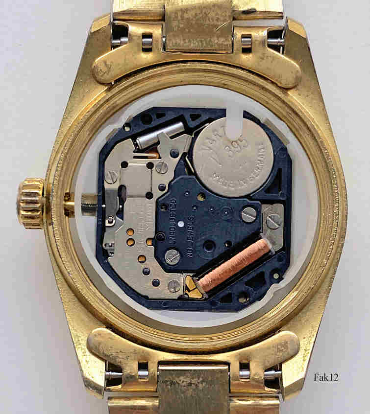 This is the copy of a Rolex Oyster, probably from China, with a simple quartz movement. Signed front: ”Rolex, Oyster Perpetual, Day-Date, Superlative Chronometer, Officially Certified, Swiss Made.”, inside: ”Shiojiri, Y144A, Japan” Date at 3 with Loupe, day at 12, Massive Metal Band.