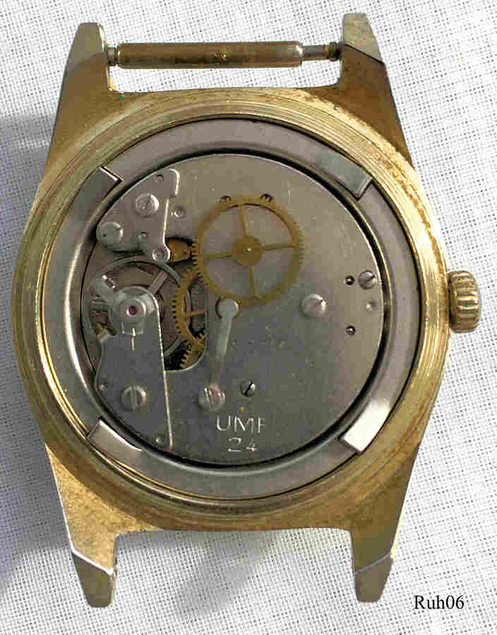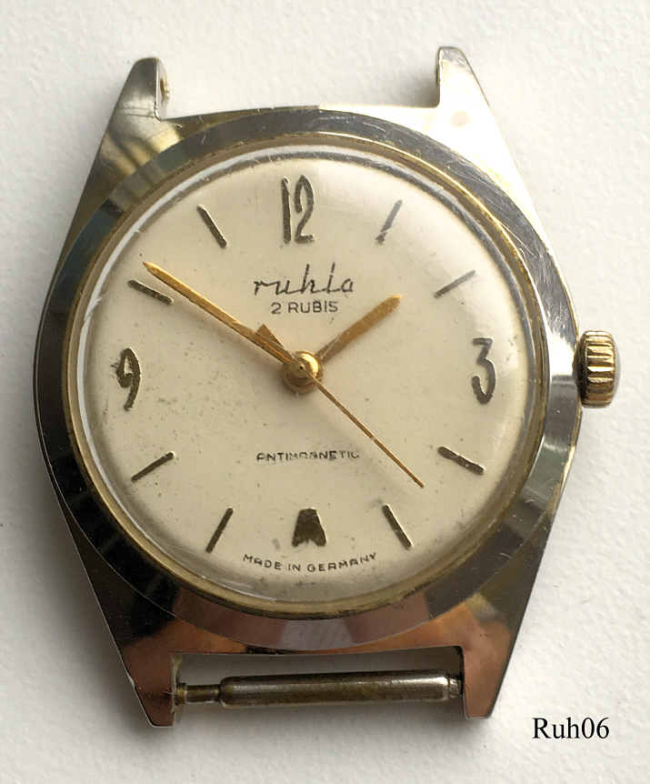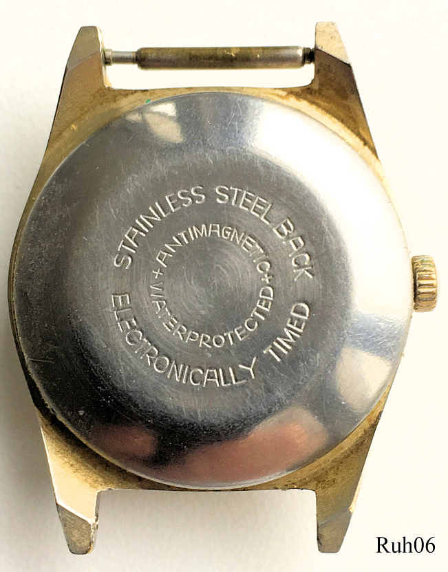 Eine Ruhla Handaufzugs Uhr mit Base Metal Gehäuse und Stainless Steel Back, eine Uhr aus der Ruhla UMF Manufaktur. Beschriftung vorn: “Ruhla, 2 Rubis, Antimagnetic, Made in Germany”, hinten: “Antimagnetic, Waterprotected, Stainless Steel Back, Electronically Timed”, innen: “UMF 24”. Uhrwerk UMF 24-42