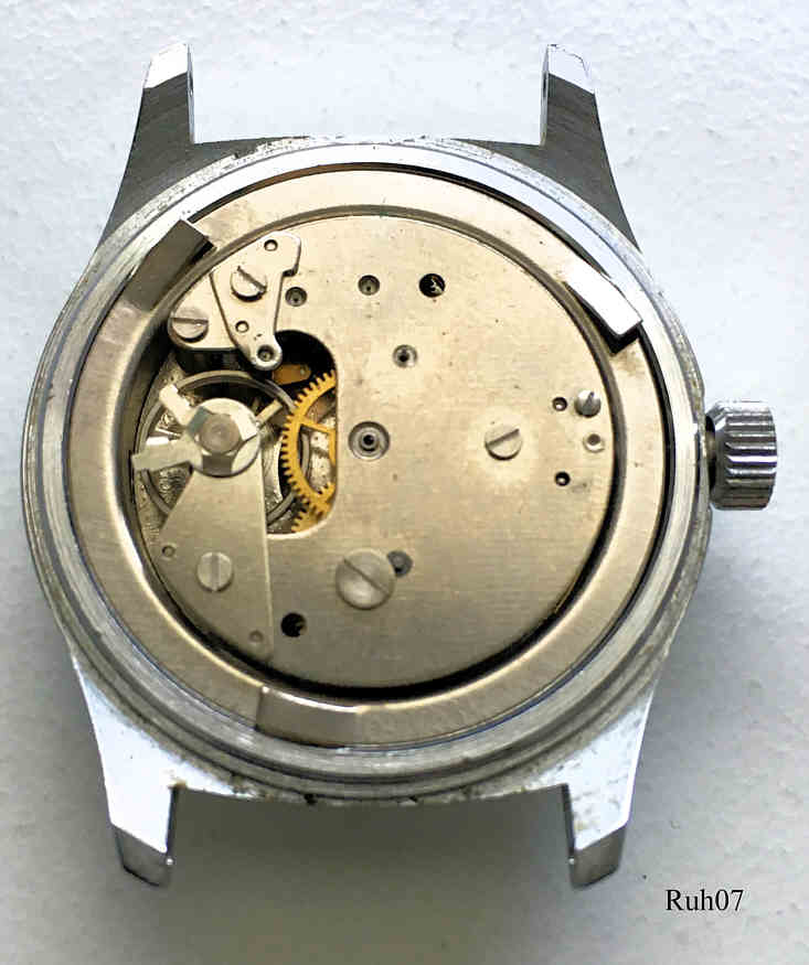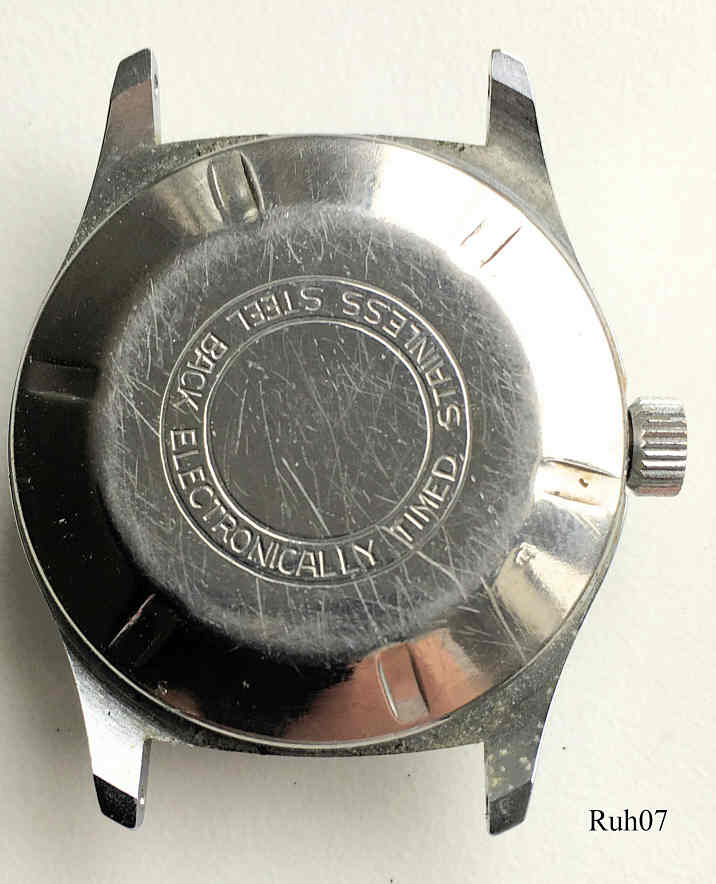 Eine Ruhla Handaufzugs Uhr mit Base Metal Gehäuse und Stainless Steel Back, eine Uhr aus der Ruhla UMF Manufaktur. kleine Sekunde bei der 6, Beschriftung vorn: “Ruhla, Antimagnetic, Made in GDR”, hinten: “Stainless Steel Back, Electronically Timed”, innen: “ ”. Uhrwerk UMF 24-31