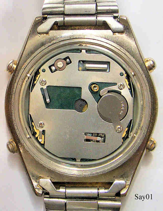 A very interesting Ana-Digi Chronograph of Sanyo. The digital part is arranged in a quarter circle around 12 and 6, and shows at 12 the choosen Function and at 6 the result. Functions are: T1, Date, Stopwatch, Alarm, T2. Stainless Steel case with metal band. Signed front: “Sanyo, Water Resist, Quartz”, back: ”Stainless Steel Back, Water Resistant, 30m, Sanyo”