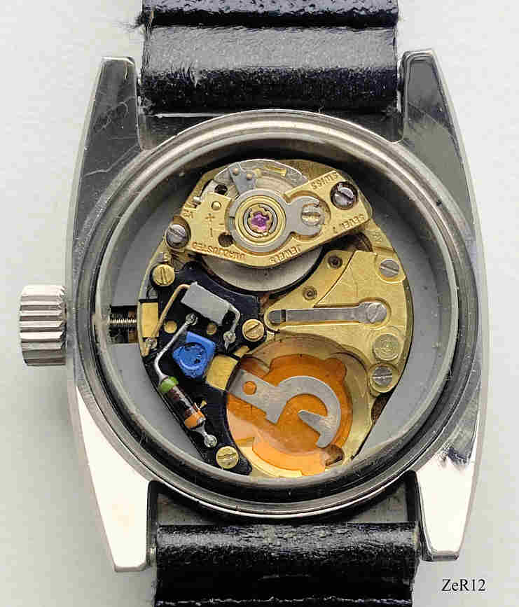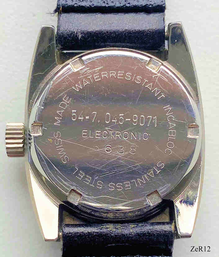 Eine schöne ZentRa Electric Damen Uhr mit einem ESA 9200 Werk. Edelstahl Gehäuse mit schwarzem Lederarmband. Beschriftet vorn: ”ZentRa, Savoy, Electronic, Swiss Made”, hinten: ”Waterresistant, Incabloc, Stainless Steel, Swiss Made, 54-7.045-9071, Electronic, 638”, innen: “Seven 7 Jewels, Unadjusted, Swiss, ESA 9200, Funtronic”.