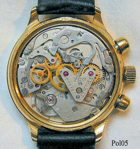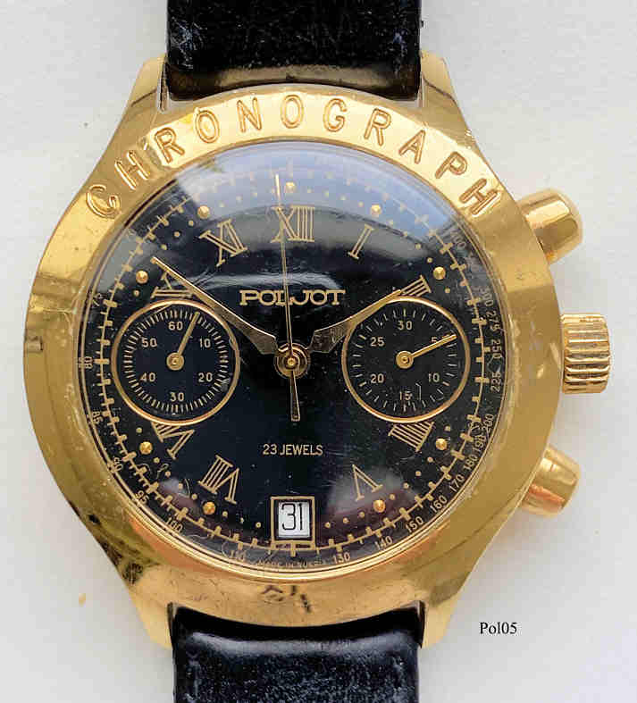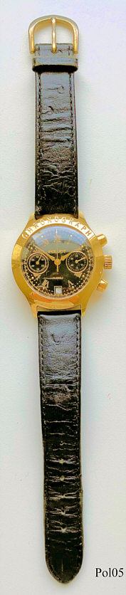 Ein schöner Poljot Chronograph mit Handaufzugs Werk. Vergoldetes Edelstahl Gehäuse mit schwarzem Lederarmband. Gehäuse Nr. 442399, Poljot Werk Kaliber P 3133, 23 Steine, Datum bei der 6. Beschriftet vorn: ”Poljot, 23 Jewels, Made in Russia”, auf dem Gehäuserand “CHRONOGRAPH”, Rückseite: ”442399”, innen: “P3133, 23 Jewels, 45132”. Römische Ziffern in Goldfarben