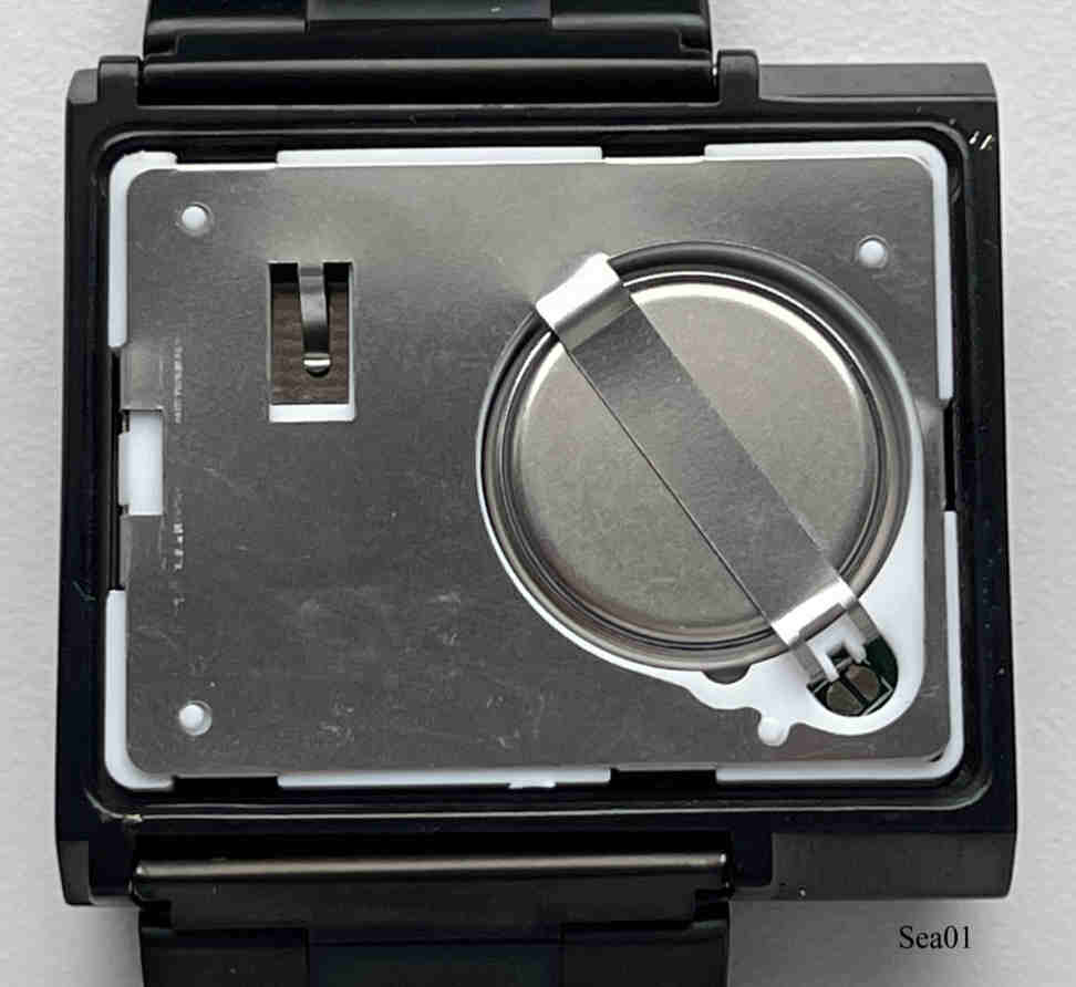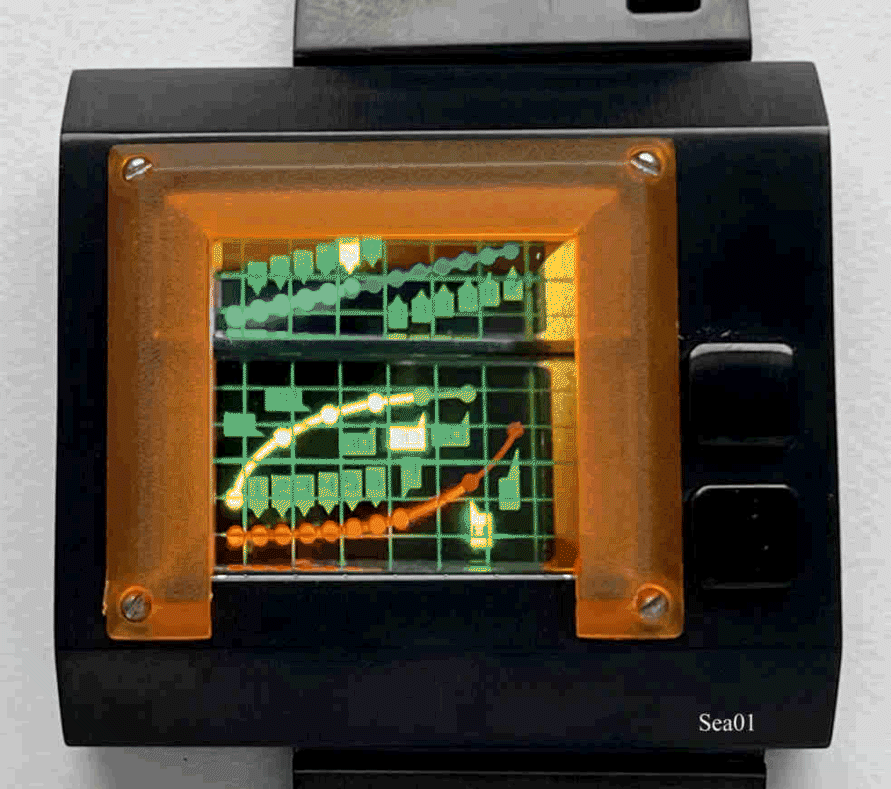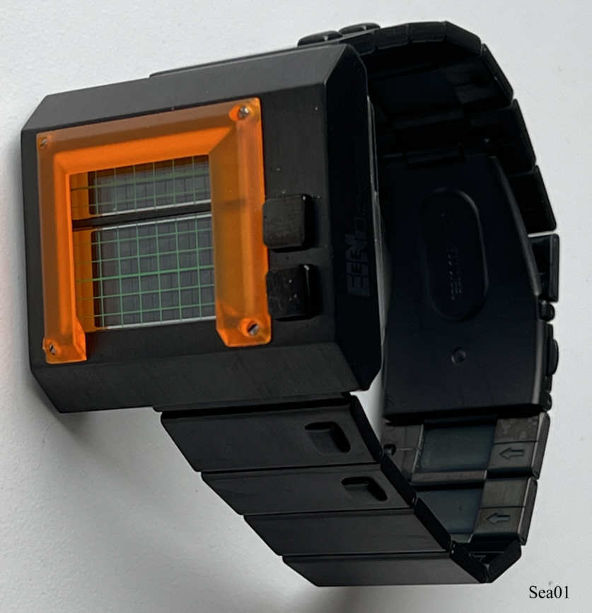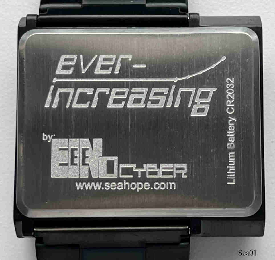Dies ist eine sehr eigenwillige Armbanduhr mit einer außergewöhnlichen Anzeige. Der obere Teil über dem weißen Strich zeigt die Stunden, der untere die 10 Minuten und die Minuten. Schweres Metall Gehäuse, stainless steel back, Anzeige im Oszilloscope Design. Die angezeigte Zeit ist: 5 Stunden, 3x 10 Minuten und 7x 1 Minute, gleich 5:37 Uhr. Bezeichnung vorn: ” ”, hinten: ”Ever Increasing”, innen: “ ”. Schweres schwarzes Metall Armband.