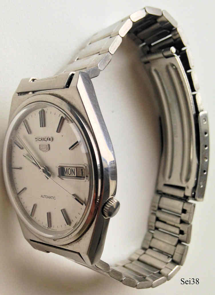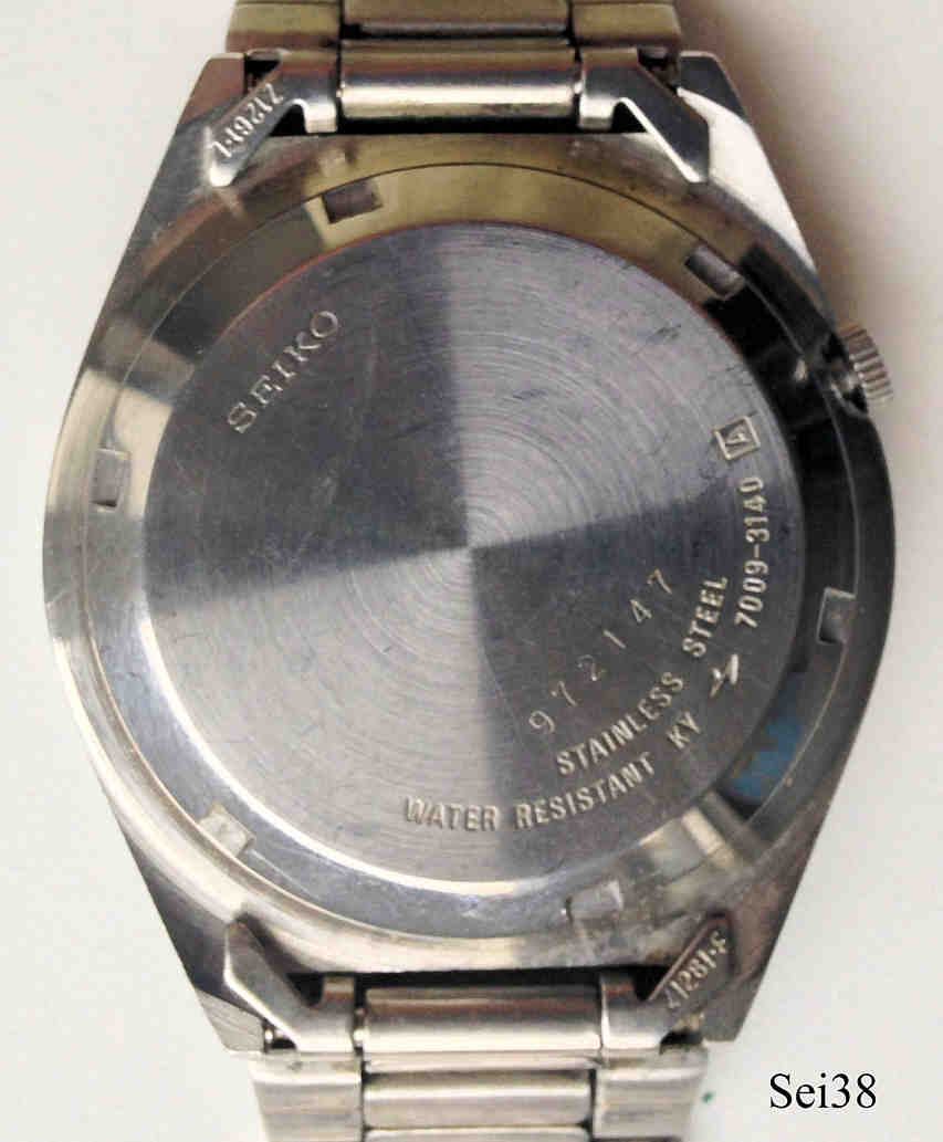 Dies ist eine Seiko 5 Automatik Uhr mit Edelstahl Gehäuse, weißem Zifferblatt und Day/Date Anzeige bei der 3. Beschriftung vorn:” SEIKO, 5, Automatic, 7009-4718 R“, hinten: “Seiko, 972147, Stainless Steel, Water Resistant, KY, 7009- 3140 A”, innen: “Seiko Time Corp, 7009, Seventeen Jewels”. Edelstahlgehäuse mit Edelstahl Boden und Metall- Gliederarmband.