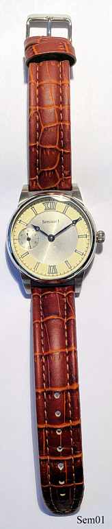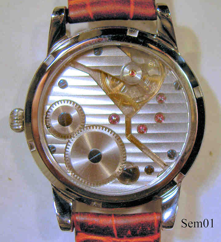 Eine Handaufzugsuhr, wie sie im Uhren Basis Seminar bei Martin Braun als Übungsobjekt verwendet wird. Diese Uhr habe ich selbst zerlegt, wieder zusammen gebaut und auf der Zeitwaage einreguliert. Es handelt sich um ein Taschenuhrwerk, baugleich dem ETA 6498, mit Zwiebelkrone. Stahlgehäuse mit Glasboden und braunem Lederarmband. Beschriftung Seminar 1.