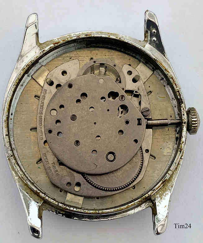 A Timex handwind mens watch of Great Britain Production. Signed front: “Timex, Water Resistant, great Britain, 2657202574”, back: “Water Resistant, Stainless Steel Back”, inside: “Timex Great Britain, No (0) Jewels, Unadjusted, 95”. Timex Caliber 935. |