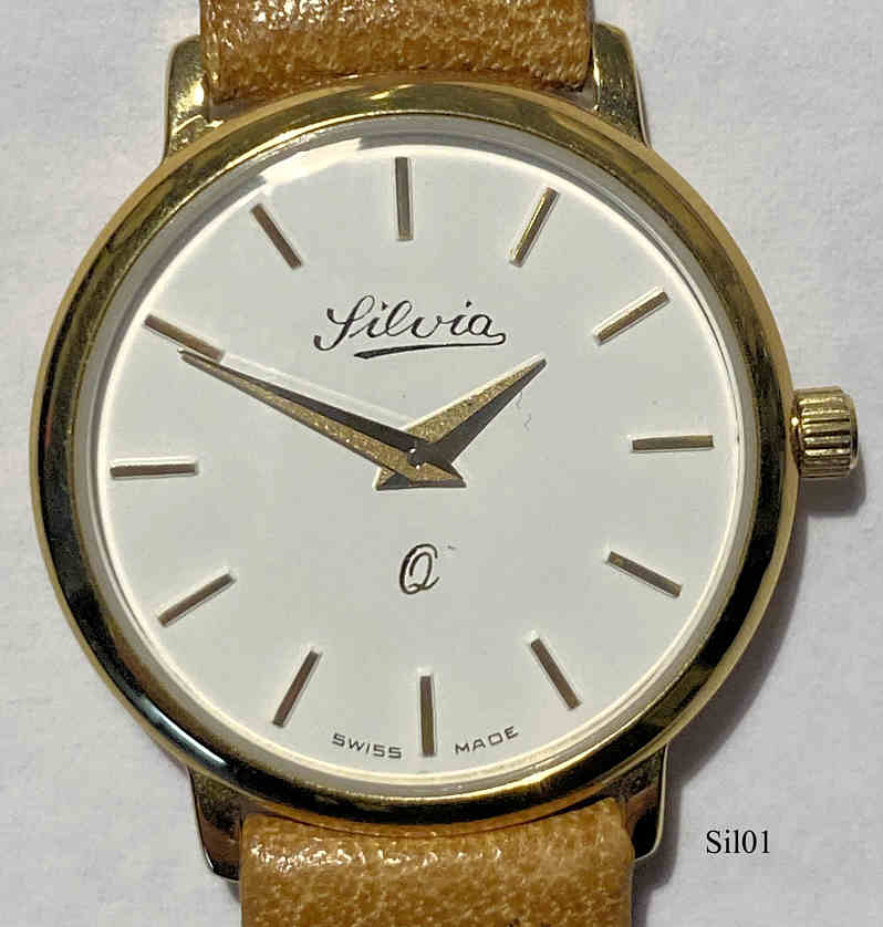 Eine schlichte, sehr schöne Silvia Damen Quartz Uhr mit Base Metal Gehäuse und Stainless Steel Back. Beschriftung vorn: ”Silvia, Q, Swiss Made”, hinten: ”11-2040”, innen: “Unadjusted, Six 6 Jewels, 978.002, Seiss V8”, Braunes Leder Armband. Kaliber ETA 978.002