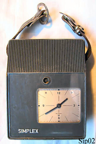 Die Simplex Stechuhr diente der Kontrolle von Sicherheitsdiensten während des Kontrollganges. Dazu waren an den wichtigen Punkten des Rundganges Schlüsselkästen angebracht, in denen Schlüssel mit entsprechender Nummer befestigt waren. Beim Kontrollgang mußte der Wächter den Schlüssel in seine Stechuhr stecken, dann wurde die Schlüsselnummer und die Zeit auf einen Kontrollstreifen abgedruckt. Die Maschine besteht aus einer mechanischen Uhr und einer Stempeleinheit. Der Schlüssel wurde auf der Rückseite in die Uhr gesteckt und herumgedreht. Dabei wurde die Nummer des Schüssels (hier die 7) zusammen mit der Stunden und Minutenscheibe in der Uhr auf einen Druckempfindlichen Papierstreifen in der Uhr abgedruckt. Damit war kontrollierbar, wann der Wächter an welcher Gebäudeposition (Schlüssselnummer) war.