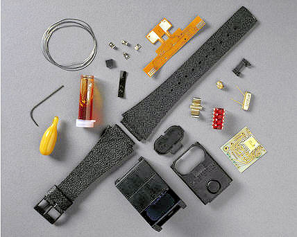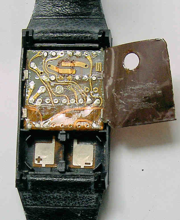 Eine Sinclair LED Uhr, Werk N° 055671.Dies ist wohl die erste kommerzielle LED Batterie Uhr, die es ab September 1975 als fertige Uhr und als Bausatz von Sir Clive Sinclair gab. Der Preis damals war 17,95 BP als Kit und 24,95 BP als fertige Uhr. Die etwas unsorgfältige Bauweise war fast der Ruin der Firma, zeitweise wurden mehr Reparaturen verschickt, als neue Uhren. Beschriftet vorn: “Sinclair”, hinten: “A055671, Made in England, Patent applied for”.