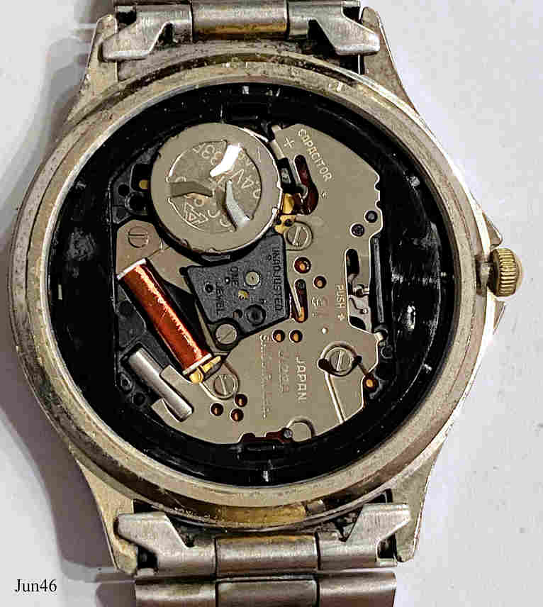 Eine Junghans Solar Damen Armbanduhr mit Kalender bei der drei. Das Zifferblatt ist eine große Solarzelle, die bei Sonnen Einstrahlung Strom erzeugt und in einem Kondensator GC920 speichert. Dieser Kondensator treibt dann eine normale Quartz Uhr an. Inschrift vorn: ”Junghans Solar 1”, hinten: ”Base Metal Bezel, Stainless Steel Back, Water Resistant 30m, QUARTZ, 24-1112”, innen: “Japan, V122A, Shiojiri Ltd., Unadjusted, One 1 Jewel”. Bicolor Metallarmband
