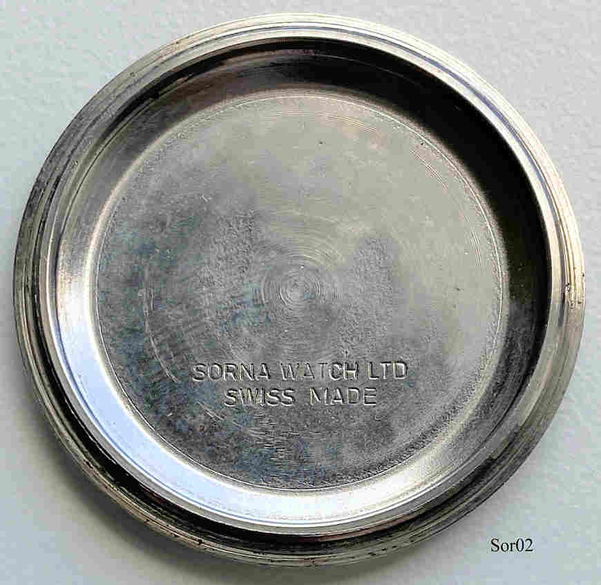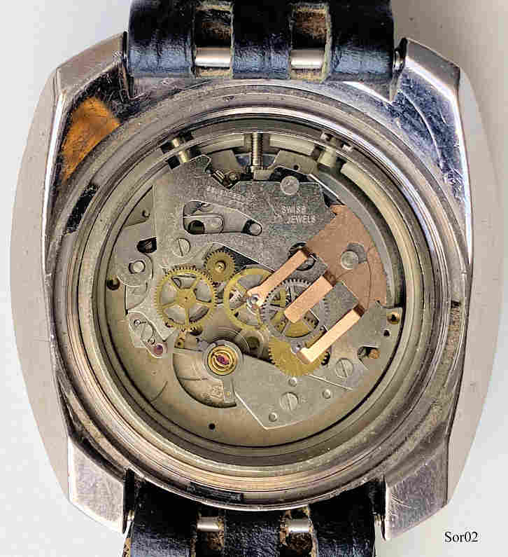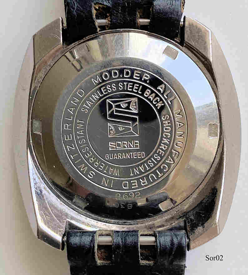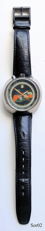 A Sorna ”Bullhead”€¯ Chronograph with stainless steel case. ”Bullhead” means that crown and pushers are located above the 12, thus on the wristband. This watch has an unusual dial design and unusual placed “eyes”, one at ”3”€¯, 0 - 60, one at ”8”, 0 - 15. Around the dial circles the grey Tachymeter scale, and above that a black world time scale with the corresponding cities. Date under ”12”. Signed front: “Sorna Chrono, 17 Jewels, Swiss Made”€¯, back: “€¯MOD. DER, All Manufactured in Switzerland, Stainless Steeel Back, Shock Resistant, Water Resistant, Sorna Guaranteed, 2692”€¯, inside: “€¯EB 8420-73, unadjusted, Swiss, seventeen 17 Jewels , Sorna Watch Co.”€¯