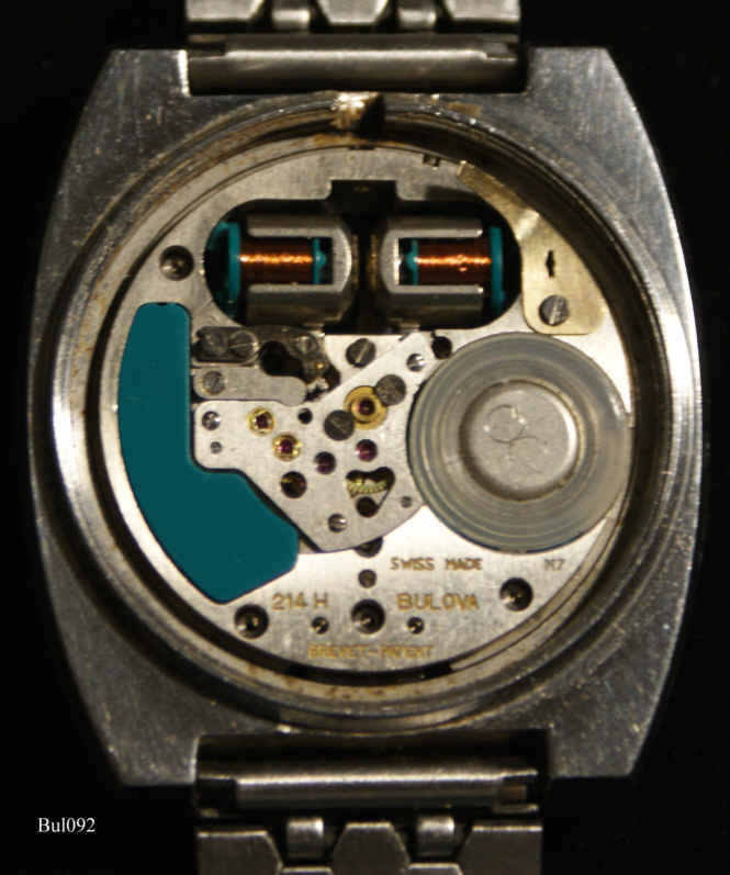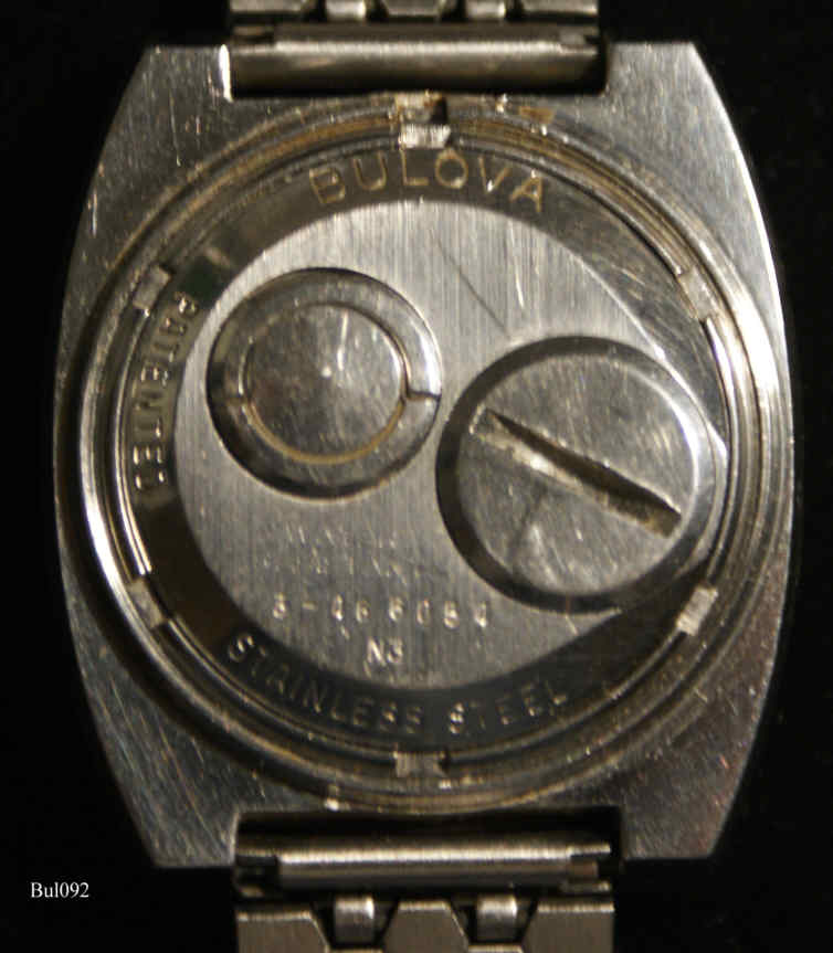Eine original Bulova Spaceview mit Edelstahl Gehäuse, Beschriftet vorn: “Bulova, Accutron”, hinten: “Bulova, Patented, Stainless Steel, Waterproof, 3-466054, N3”, innen: “Bulova, 214H, Swiss Made, Brevet - Patent, M7”, Caliber 214H, Herstelldatum 1967 (M7), Werk mit Silizium Transistor (2 Draht), verschraubter Boden, Einstellung über Stellring an der Rückseite. Edelstahl Gliederband mit Bulova Schließe.