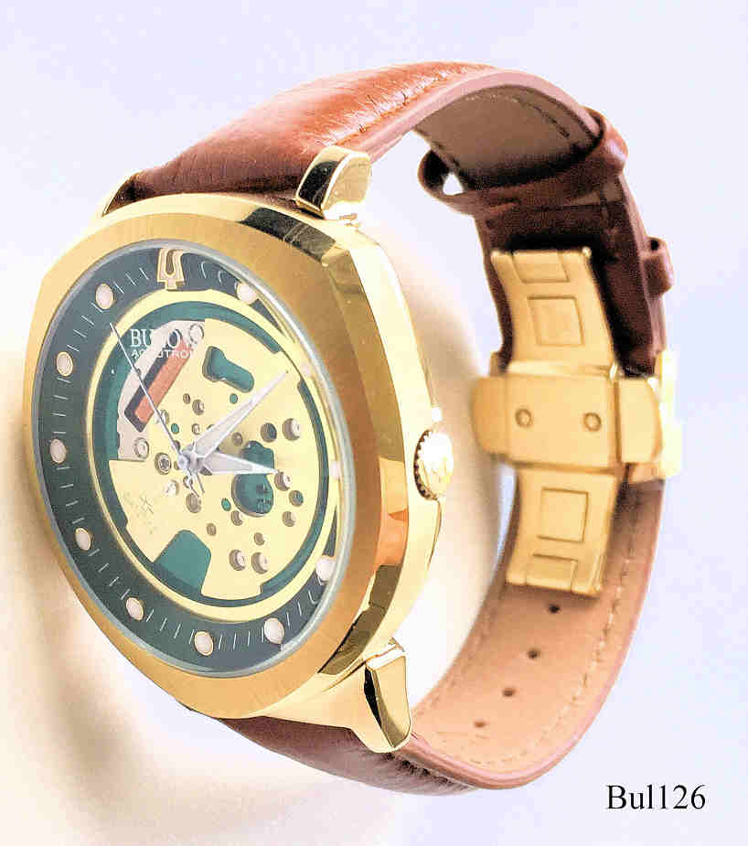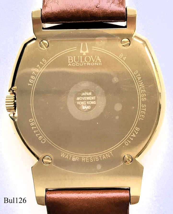 Eine Bulova Accutron II Spaceview mit Precisionist Werk, bei dem sich der Sekundenzeiger kontinuierlich bewegt. Beschriftet vorne:” Bulova, Accutron II, BA 101.10”, hinten: “Bulova, Accutron II, B4, Stainless Steel, 97A110, Water Resistant, C977780, 16879715, Japan Movement, Hong Kong Band ” innen:” ”. Datumscode B4 = 2014, Movement BA 101.10 Precisionist, Braunes Lederarmband.