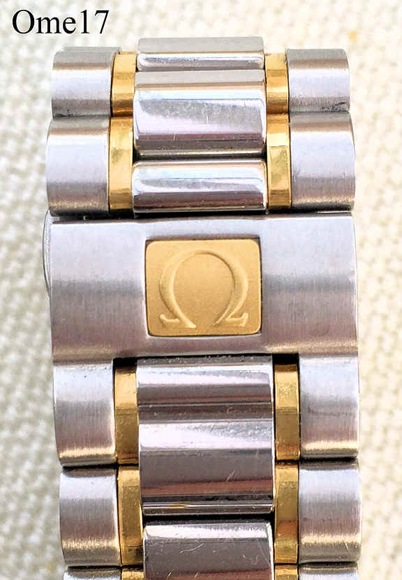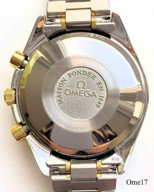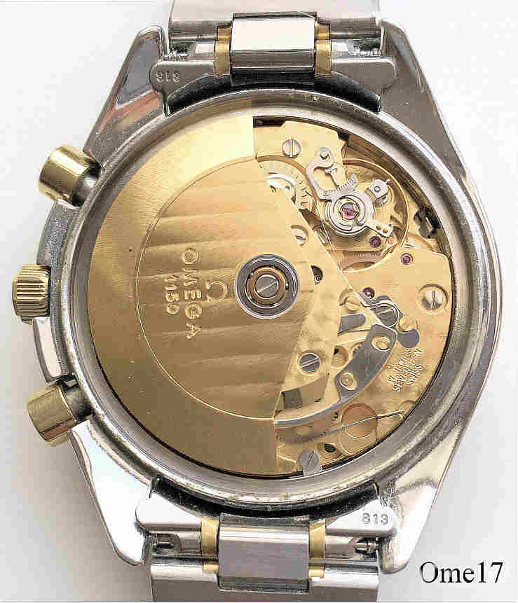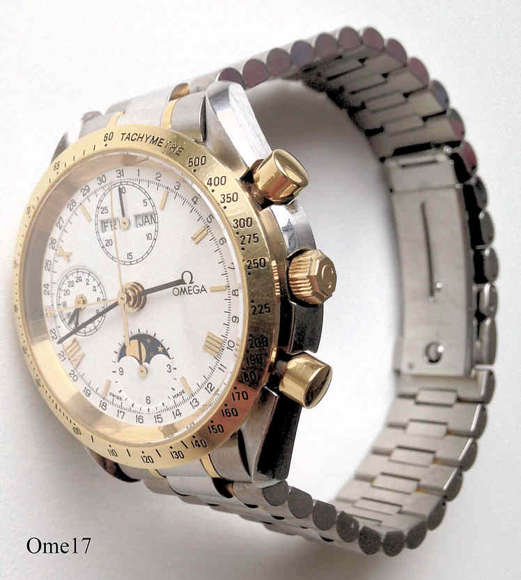 Dies ist eine etwas untypische Omega Speedmaster Moonphase mit dem Automatic Werk Omega 1150, basierend auf dem Valjoux 7751. Das Gehäuse ist gleich mit der Speedmaster Reduced Serie plus einem Drücker bei der 10 zur Kalender Korrektur. Sie hat einen Vollkalender, Tag und Monat bei der 12, Datum durch einen Zeiger auf dem Außenring im Zifferblatt. Der Tachoring ist 18 Karat Gold, Drücker und Krone sind vergoldet. Beschriftet vorn: “Omega, Swiss Made”, hinten: “Maison Fondee En 1848, 54228151”, innen: “Omega 1150, 17 Jewels, Seventeen, Swiss”. Werk N°:375.0034 , Caliber 1150, Referenz Nr.: 3330.20, Edelstahl Gehäuse, Edelstahl Band.