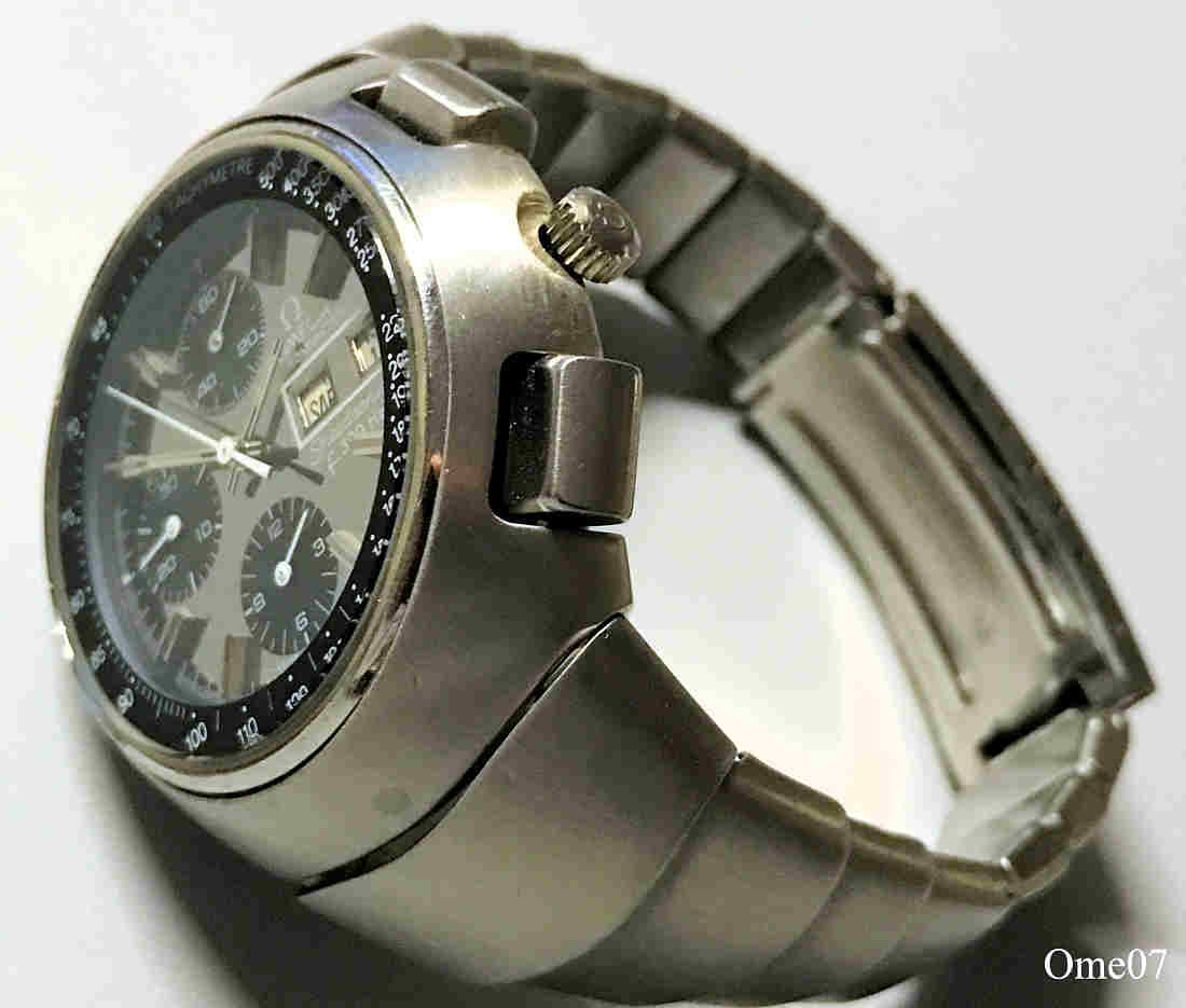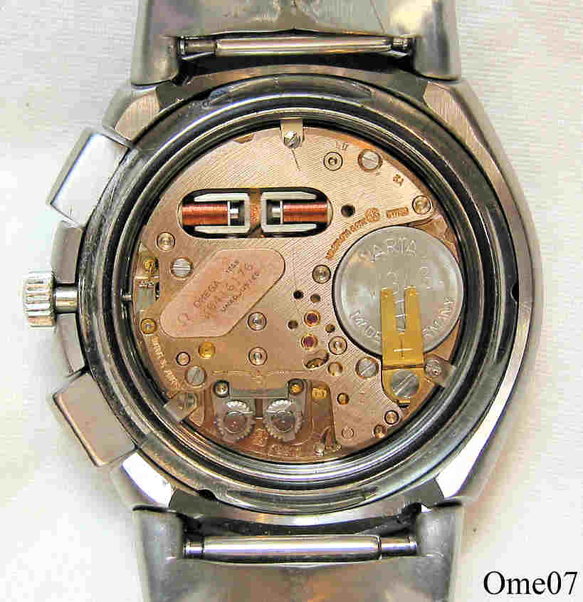 Ein Omega Speedsonic Chronograph, Werk Caliber 1255, Caliber ESA 9210, 12 Steine, Werknummer 38416176, Gehäuse Nr. 1880001, Edelstahlgehäuse mit dem ”Languste”€¯ Band. Beschriftet: “€¯Omega, Chronometer, Speedsonic, f300 Hz, Swiss Made”€¯, innen: “€¯Twelve 12 Jewels, Omega, 1255, unadjusted, 38417176”€¯, im Deckel: €¯”Omega Watch Co., Fab Suisse, Swiss Made, Acier inoxydable, Brevet + 508925, 188.0001, 388.0800, Movement Licensed Bulova & Pat. ESA”. Datum und Kalender bei der 3, Tachymeterscheibe in schwarz, eckige Drücker. Eine sehr schöne Beschreibung der Uhr gibt es hier: http://www.zetleins.onau.net/reviews/SpeedsonicReview.htm