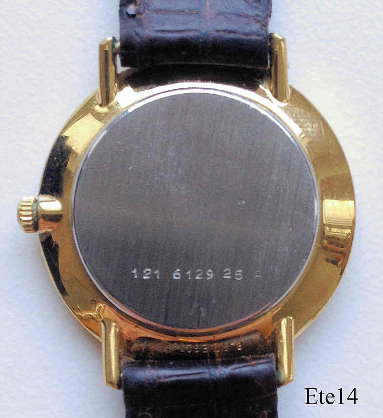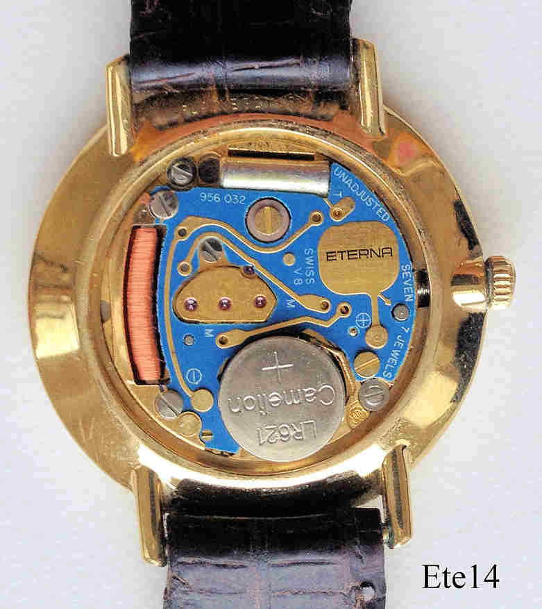 Dies ist eine Eterna Quartz Damenuhr, Kaliber ETA 956.032, Referenz Nr.: 121 6129 25 A, vergoldetes Gehäuse, Edelstahlboden, Mineral Glas. Bezeichnung vorn: ”Eterna, Q”, hinten: ”121 6129 25 A”, innen: “Eterna, Unadjusted, Seven 7 Jewels, Swiss V8, 956.032”. Auf dem Goldrand hinten: “Plaque G20” und “ERG” im Rhombus. Schwarzes Kroko Armband mit Eterna Schließe.