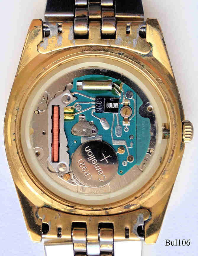 Bulova Super Seville Quartzwatch with a goldtone dial, date at 3 with loupe, signed front: “ Bulova, Super Seville, Calendar”, hinten: “BULOVA, P6, Water Resistant, Base Metal Bezel, 8694101, 8-140321”, Caliber ETA 555.115 .Production year 1986 (P6). Goldtone metal band with Bulova clasp.