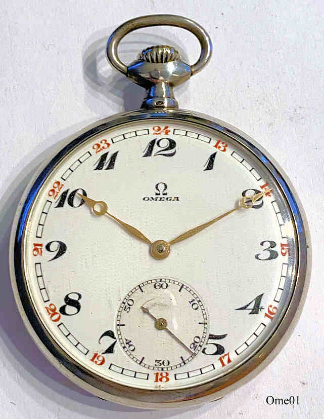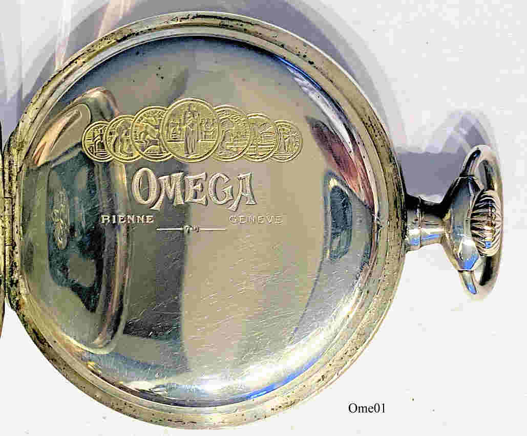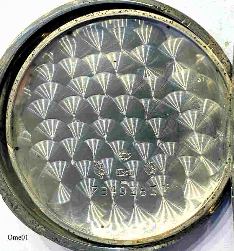 Eine Omega Taschenuhr mit silbernem Gehäuse und zwei Klappdeckeln. Beschriftet innen am äußeren Rückdeckel: ”0,800, 7349263”,€ außen am inneren Deckel: ”Omega, Bienne, Geneve, 7349263, 0.800”,€ innen am inneren Deckel: “0.800, 7349263”, Werk: ”Omega Watch Co Swiss, ADJ. 2 Two Positions,15 fifteen Jewels, 6607934”. Werk Omega 40.6 L.T. ca. 1920
