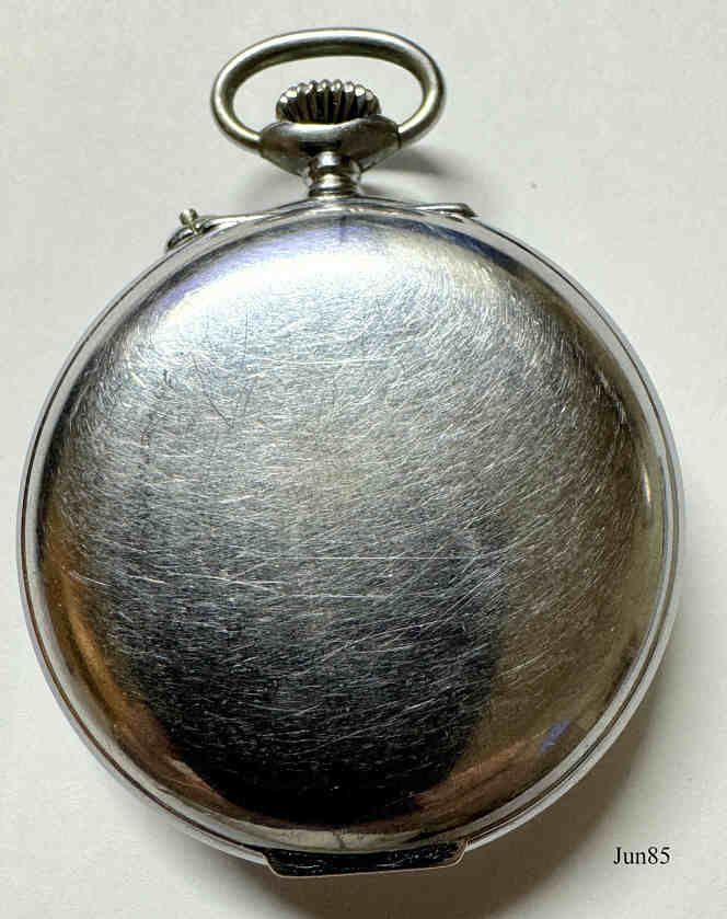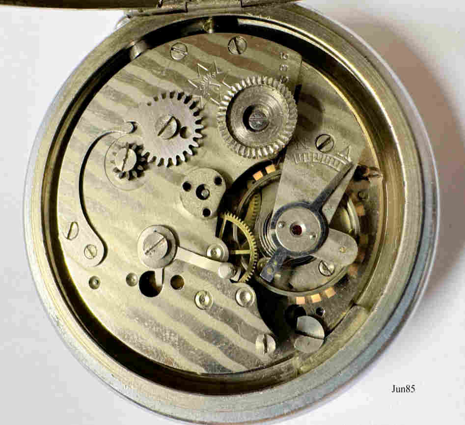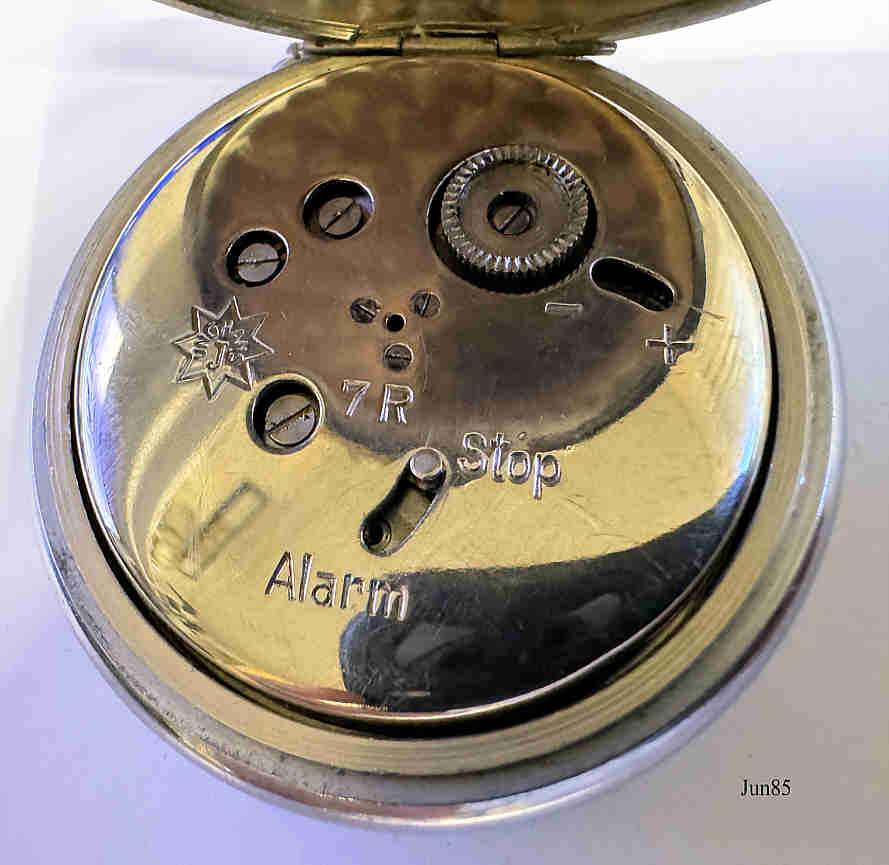 Eine Junghans Taschenuhr mit Wecker Funktion. Gehäuse Base Metall, Kaliber J36. Beschriftet vorn: “Junghans” Innen: ”Logo, J36, 20635”, hinten: “ ” Kaliber J36. Über den gezahnten Knop auf der Innenseite wird die Weckzeit eingestellt, sichtbar deurch den silbernen Zeiger bei der 8. Der Schieber “Stop / Alarm” schaltet die Alarmfunktion ein. Der Weckton wird erzeugt durch einen Stempel, der gegen die Gehäusewand schlägt. |