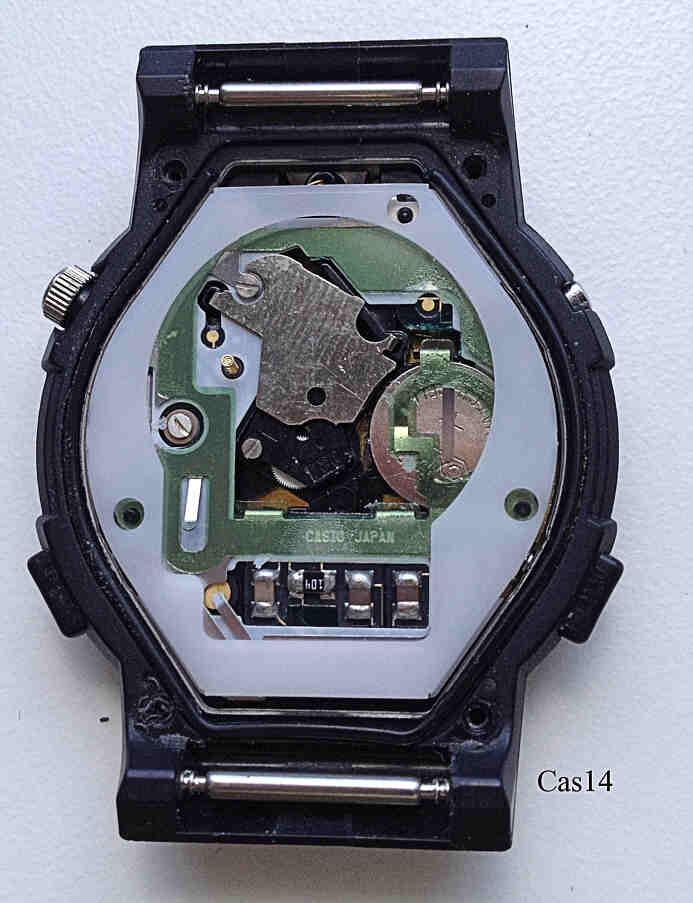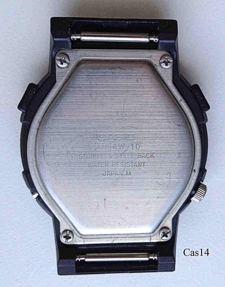 Ein moderner Ana-Digi Chronograph von Casio mit Thermometer. Kuststoff Gehäuse. Beschriftet vorn: ”Casio, Thermo Meter, 111A2-N46, Japan, A”, innen: ”Casio, Japan”, hinten: ”Casio, 378 AW-10 Stainless Steel Back, Water resistant, Japan M”. Der Knopf über der 12 ist der Temparatur Sensor.