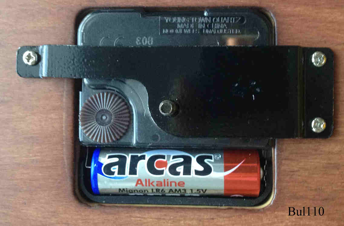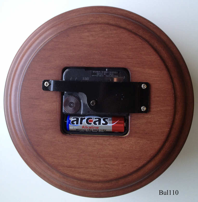 Dies ist eine Bulova Tolland clock, auch Tape Meter Clock genannt. Kunststoff Gehäuse im Holz Look, das Uhrwerk befindet sich unter der Messing Haube. Im Betrieb dreht sich das “Bandmaß” unter dem Feststehenden Zeiger und zeigt so die Zeit an (hier: 10:40 Uhr)