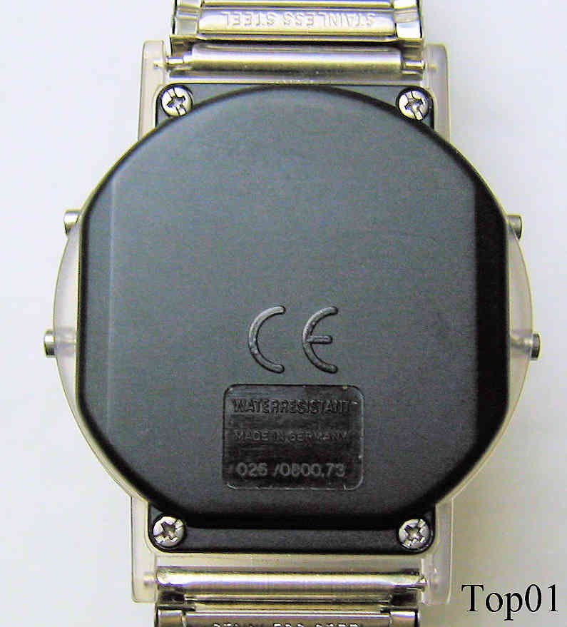 Dies ist ein Funk Chronograph der Marke Topline. Beschriftung vorn: “Chronograph, Topline, Radio Controlled”, hinten: “Water Resistant, Made in Germany, 026/0800.73”. Klarsichtiges Kunststoff Gehäuse, schwarzer Plastikboden, Edelstahl Armband mit neutraler Schließe. |