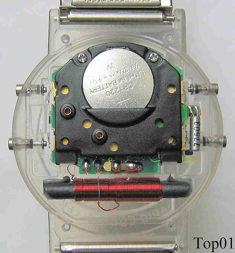A radio controlled Chronograph of the Topline Brand. Signed front: “Chronograph, Topline, Radio Controlled”, back: “Water Resistant, Made in Germany, 026/0800.73”, Clear plastic case, black plastic back. Stainless steel band with neutral clasp.. |