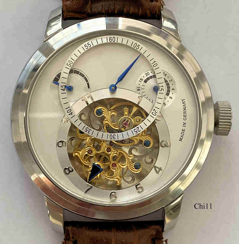 Eine riesengroße Armbanduhr in sehr eigenwilligem Design. Das Zifferblatt zeigt: Oben links die Gangreserve, rechts den GMT Zeiger, in der Mitte die Minuten und unten die Stundenanzeige. Diese wird durch fast das gesamte Uhrwerk vorgenommen, was sich in 12 Stunden einmal um sich selbst dreht in der Art eines “Stunden Tourbillons”, als welches es auch verkauft wurde, eigendlich ist es ein Karussellwerk. Beschriftet vorn: ”Made in Germany”. Metall Gehäuse mit braunem Leder Armband.