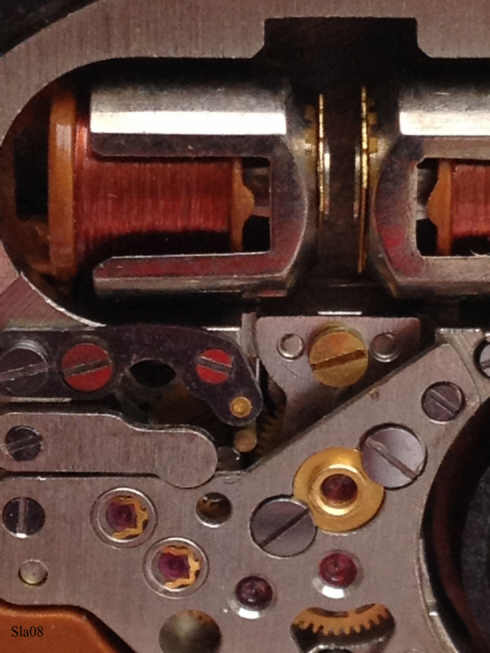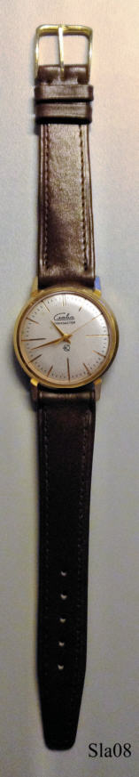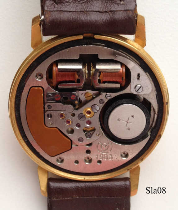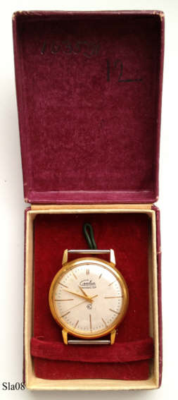 Dies ist eine sehr seltene Slava Transistor, eine Kopie der Bulova 214 durch Slava. Die Kopie ist so gut, daß scheinbar die Teile mit der Bulova 214 direkt austauschbar sind. Kaliber 2937. Beschriftung vorn:“SLAVA, Transistor, Symbol” innen:”€Logo, 1583”€ hinten:”€keine Beschriftung”€ Gehäuse vergoldet, die Kunststoffteile sind in orange gehalten, bei Bulova sind sie grün. Die erste Slava Transistor wurde 1962 gebaut. Ich habe gehört, daß 1000 Slava Transistor im ersten Lot gefertigt wurden, danach wurden sie nicht mehr hergestellt. Original Text eines Verkäufers aus der Ukraine: Diese exclusive Uhrenserie wurde in der 2. Moskauer Uhrenfabrik "Slava" in 1962 gefertigt. Slava Transistor ist das Pendant der Bulova Accutron. Bekannt ist, daß diese Uhr entstand, nachdem Nikita Sergeyevich Khrushchev (General Sekretär der Kommunistischen Partei der Soviet Union von 1953 bis 1964) von seiner berühmten USA Reise mit einem neuen Wunder Amerikanischer Technologie zurück kam (Bulova Accutron war ein übliches Geschenk der Amerikanischen Regierung an Staatsgäste). Er forderte von den USSR Spezialisten, diese Uhr ebenfalls zu bauen. "Yes, we can!" war die enthusiastische Antwort der Fabrik und kurze Zeit darauf begann die Musterfertigung. Die größte Schwierigkeit war, das Indexrad zu fertigen wegen der hohen Zähnezahl auf kleinstem Durchmesser (in der Bulova Accutron 320 Zähne auf 5mm Durchmesser) und anderer Hochtechnologie, Also war es sehr schwierig eine zuverlässige Kopie zu bauen. Soweit mir bekannt ist wurden nur 1000 USSR's Slava Transistor gebaut, danach wurde die Produktion eingestellt. Dies ist eine der wenigen mir bekannten funktionierenden Slava Transistor Uhren!