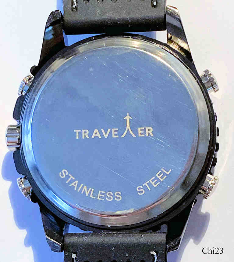 A Traveller Ana-Digi Chronograph. Stainless Steel case, signed front: ”Travellert”, inside: 2017/12 ”, back: ”Traveller, Stainless Steel”. At 6 an LCD Display to show the funktions, at 3 an eye for Month/Day, at 12 an eye for the weekday, at 9 an eye for additional functions: Stopwatch, Chrono, Alarm. A special rubber band.