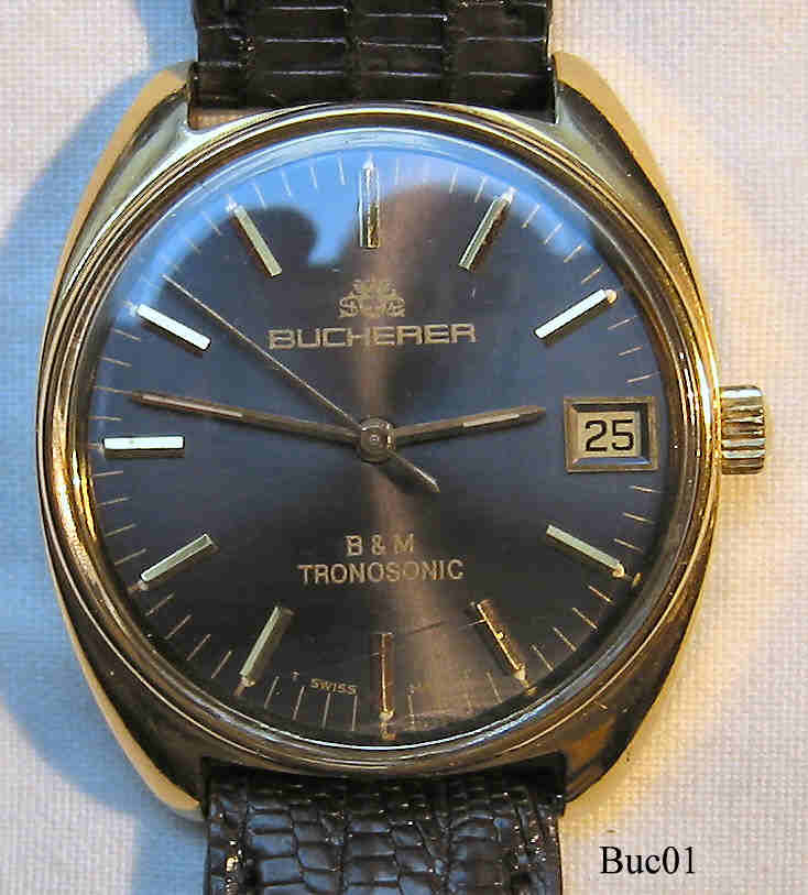 Dies ist eine Bucherer Tronosonic, ESA 9162, Referenz Nr.: 5103, schweres Messing Gehäuse vergoldet, stainless steel back, Kalender bei der 3. Bezeichnung auf dem Zifferblatt: ”Bucherer, B&M, Tronosonic, Swiss Made”, In der Rückwand: ”434095,5108 ”, innen: “Baume&Mercier, Geneve, BM 19162”