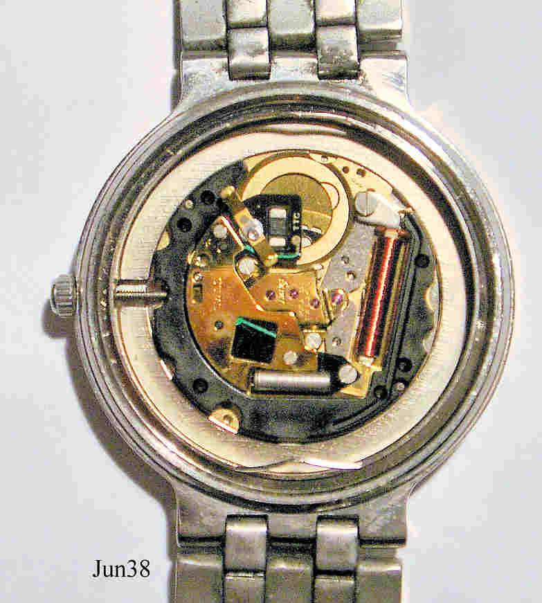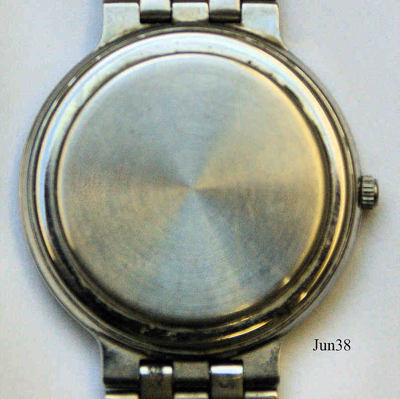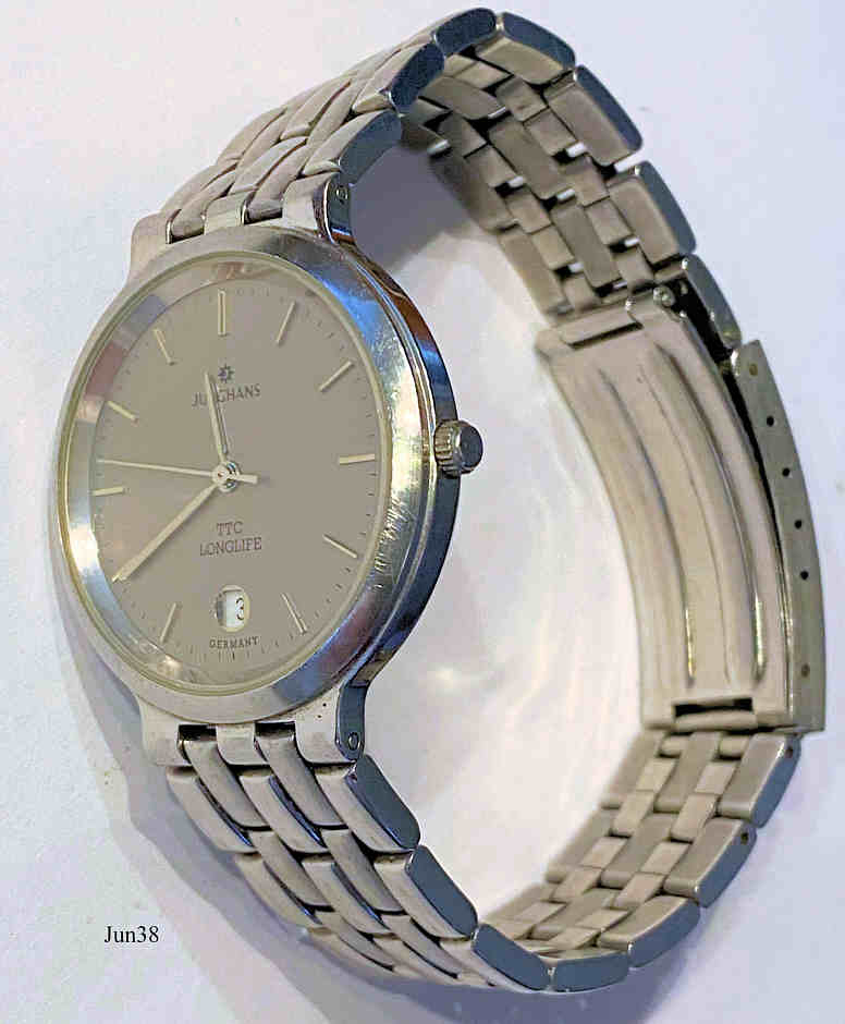 A Junghans watch with a clear grey dial, Date at 6. Signed front: “Junghans, TTC, Longlife, Germany”, The same watch has been issued by ISECO, Junghans then took over, after ISECO went bankrupt. Longlife refers to the battery, Iseco warrants 20 years of battery life. The whole back is the battery. ISECO did not stand the 20 years and Junghans took over with the Battery surplus.